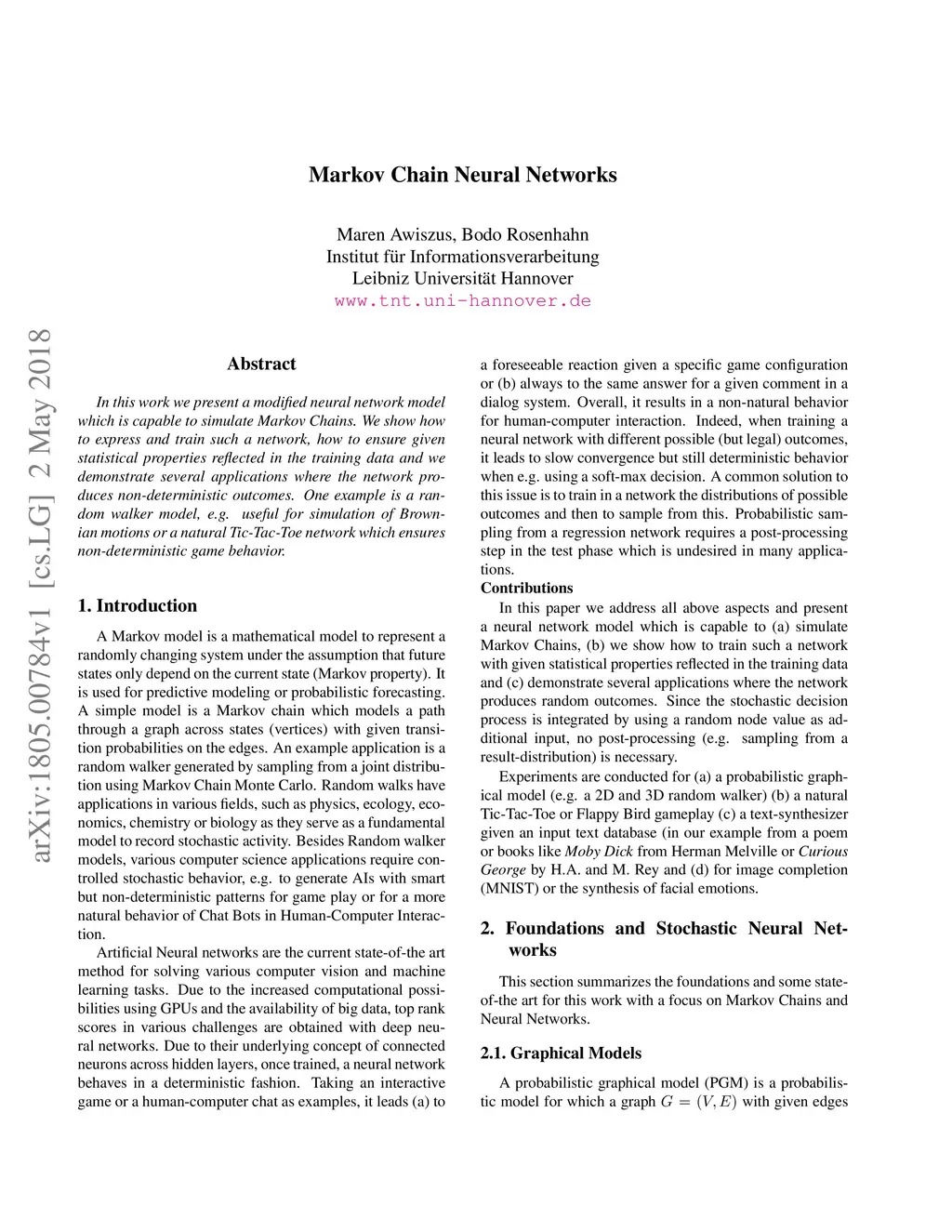 In this work we present a modified neural network model which is capable to simulate Markov Chains. We show how to express and train such a network, how to ensure given statistical properties reflected in the training data and we demonstrate several applications where the network produces non-deterministic outcomes. One example is a random walker model, e.g. useful for simulation of Brownian motions or a natural Tic-Tac-Toe network which ensures non-deterministic game behavior.