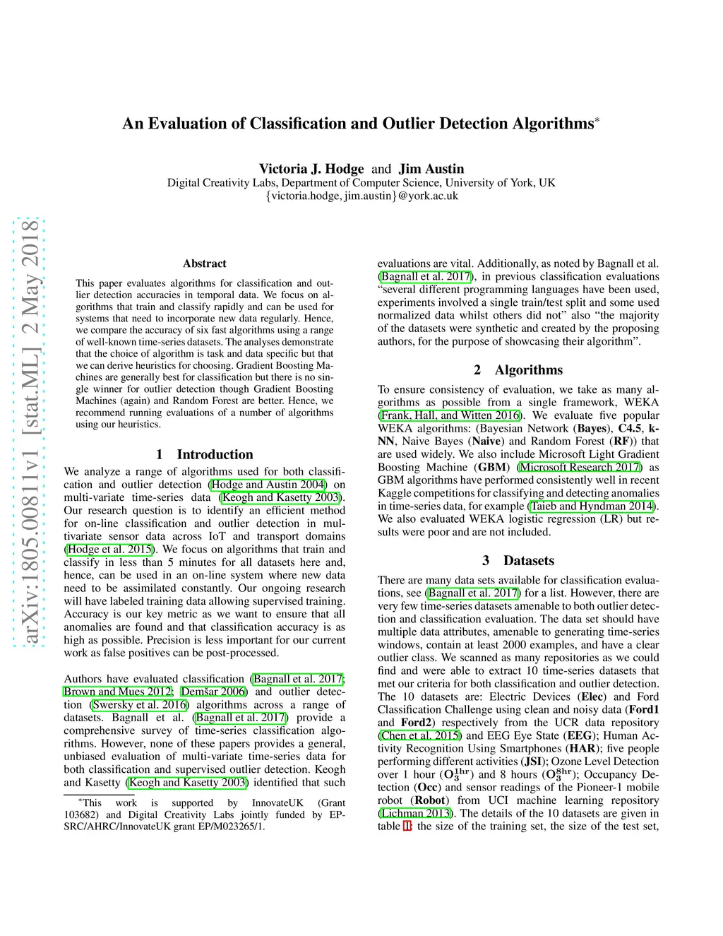 This paper evaluates algorithms for classification and outlier detection accuracies in temporal data. We focus on algorithms that train and classify rapidly and can be used for systems that need to incorporate new data regularly. Hence, we compare the accuracy of six fast algorithms using a range of well-known time-series datasets. The analyses demonstrate that the choice of algorithm is task and data specific but that we can derive heuristics for choosing. Gradient Boosting Machines are generally best for classification but there is no single winner for outlier detection though Gradient Boosting Machines (again) and Random Forest are better. Hence, we recommend running evaluations of a number of algorithms using our heuristics.