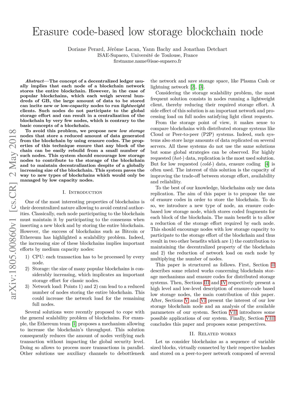 The concept of a decentralized ledger usually implies that each node of a blockchain network stores the entire blockchain. However, in the case of popular blockchains, which each weigh several hundreds of GB, the large amount of data to be stored can incite new or low-capacity nodes to run lightweight clients. Such nodes do not participate to the global storage effort and can result in a centralization of the blockchain by very few nodes, which is contrary to the basic concepts of a blockchain. To avoid this problem, we propose new low storage nodes that store a reduced amount of data generated from the blockchain by using erasure codes. The properties of this technique ensure that any block of the chain can be easily rebuild from a small number of such nodes. This system should encourage low storage nodes to contribute to the storage of the blockchain and to maintain decentralization despite of a globally increasing size of the blockchain. This system paves the way to new types of blockchains which would only be managed by low capacity nodes.