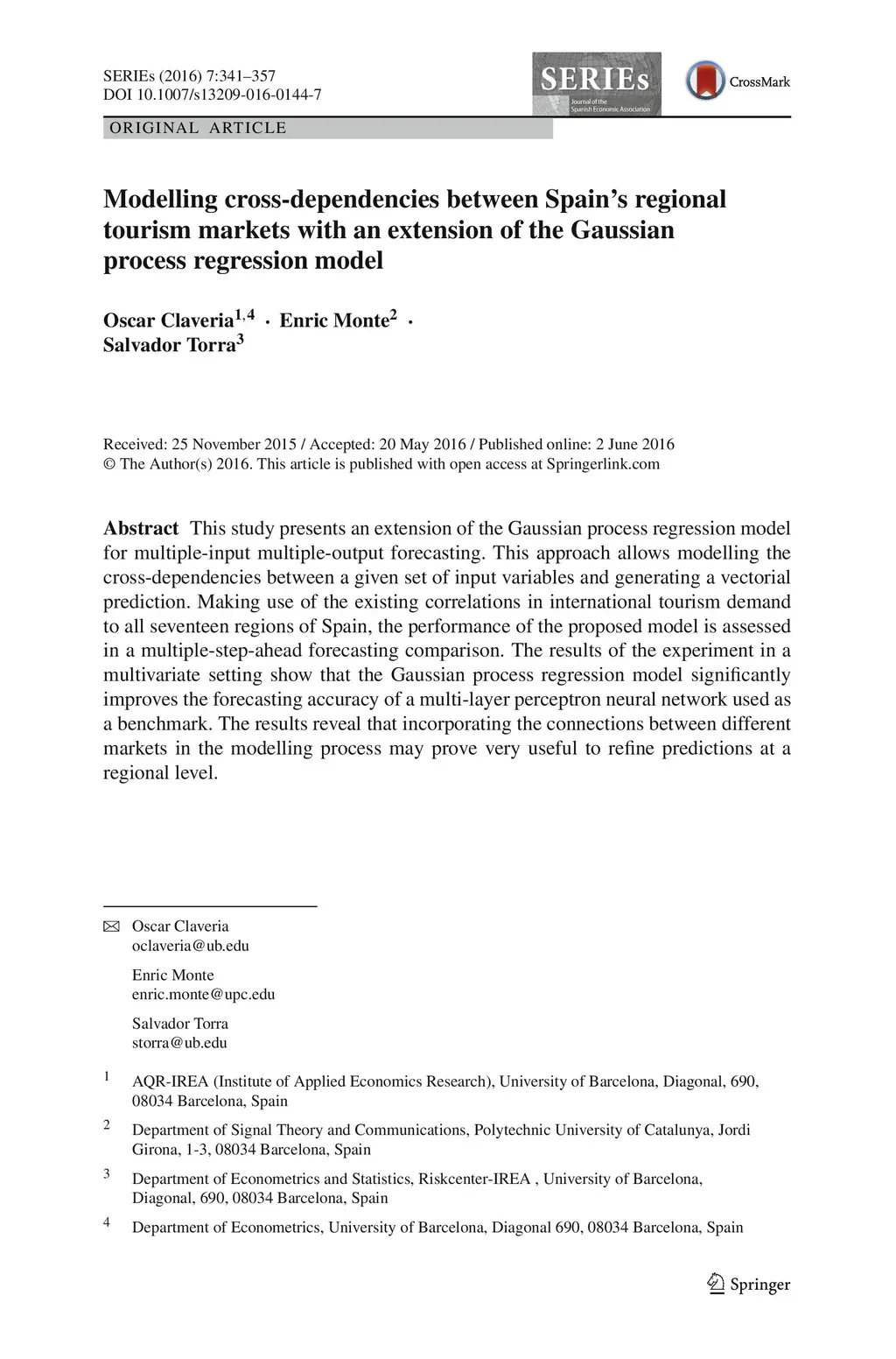 This study presents an extension of the Gaussian process regression model for multiple-input multiple-output forecasting. This approach allows modelling the cross-dependencies between a given set of input variables and generating a vectorial prediction. Making use of the existing correlations in international tourism demand to all seventeen regions of Spain, the performance of the proposed model is assessed in a multiple-step-ahead forecasting comparison. The results of the experiment in a multivariate setting show that the Gaussian process regression model significantly improves the forecasting accuracy of a multi-layer perceptron neural network used as a benchmark. The results reveal that incorporating the connections between different markets in the modelling process may prove very useful to refine predictions at a regional level.
