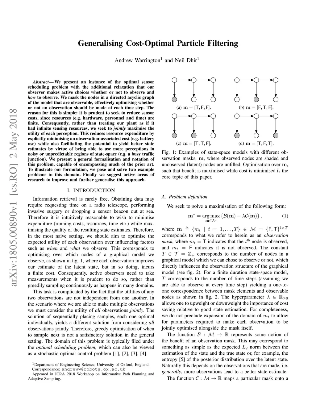 We present an instance of the optimal sensor scheduling problem with the additional relaxation that our observer makes active choices whether or not to observe and how to observe. We mask the nodes in a directed acyclic graph of the model that are observable, effectively optimising whether or not an observation should be made at each time step. The reason for this is simple: it is prudent to seek to reduce sensor costs, since resources (e.g. hardware, personnel and time) are finite. Consequently, rather than treating our plant as if it had infinite sensing resources, we seek to jointly maximise the utility of each perception. This reduces resource expenditure by explicitly minimising an observation-associated cost (e.g. battery use) while also facilitating the potential to yield better state estimates by virtue of being able to use more perceptions in noisy or unpredictable regions of state-space (e.g. a busy traffic junction). We present a general formalisation and notation of this problem, capable of encompassing much of the prior art. To illustrate our formulation, we pose and solve two example problems in this domain. Finally we suggest active areas of research to improve and further generalise this approach.