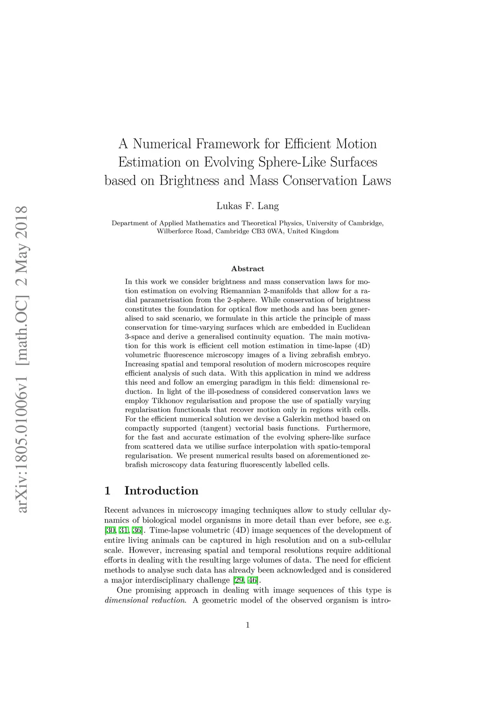 In this work we consider brightness and mass conservation laws for motion estimation on evolving Riemannian 2-manifolds that allow for a radial parametrisation from the 2-sphere. While conservation of brightness constitutes the foundation for optical flow methods and has been generalised to said scenario, we formulate in this article the principle of mass conservation for time-varying surfaces which are embedded in Euclidean 3-space and derive a generalised continuity equation. The main motivation for this work is efficient cell motion estimation in time-lapse (4D) volumetric fluorescence microscopy images of a living zebrafish embryo. Increasing spatial and temporal resolution of modern microscopes require efficient analysis of such data. With this application in mind we address this need and follow an emerging paradigm in this field: dimensional reduction. In light of the ill-posedness of considered conservation laws we employ Tikhonov regularisation and propose the use of spatially varying regularisation functionals that recover motion only in regions with cells. For the efficient numerical solution we devise a Galerkin method based on compactly supported (tangent) vectorial basis functions. Furthermore, for the fast and accurate estimation of the evolving sphere-like surface from scattered data we utilise surface interpolation with spatio-temporal regularisation. We present numerical results based on aforementioned zebrafish microscopy data featuring fluorescently labelled cells.