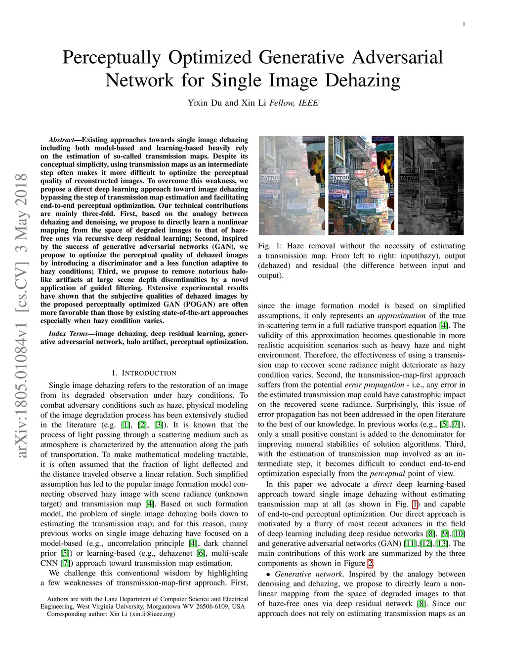 Existing approaches towards single image dehazing including both model-based and learning-based heavily rely on the estimation of so-called transmission maps. Despite its conceptual simplicity, using transmission maps as an intermediate step often makes it more difficult to optimize the perceptual quality of reconstructed images. To overcome this weakness, we propose a direct deep learning approach toward image dehazing bypassing the step of transmission map estimation and facilitating end-to-end perceptual optimization. Our technical contributions are mainly three-fold. First, based on the analogy between dehazing and denoising, we propose to directly learn a nonlinear mapping from the space of degraded images to that of haze-free ones via recursive deep residual learning; Second, inspired by the success of generative adversarial networks (GAN), we propose to optimize the perceptual quality of dehazed images by introducing a discriminator and a loss function adaptive to hazy conditions; Third, we propose to remove notorious halo-like artifacts at large scene depth discontinuities by a novel application of guided filtering. Extensive experimental results have shown that the subjective qualities of dehazed images by the proposed perceptually optimized GAN (POGAN) are often more favorable than those by existing state-of-the-art approaches especially when hazy condition varies.