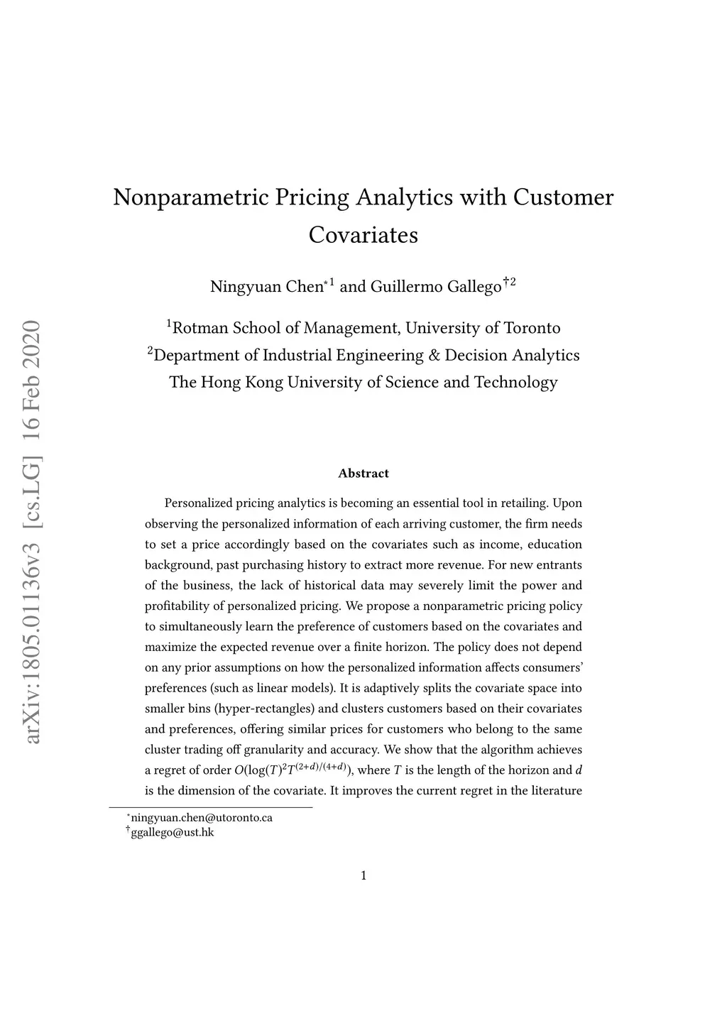 Personalized pricing analytics is becoming an essential tool in retailing. Upon observing the personalized information of each arriving customer, the firm needs to set a price accordingly based on the covariates such as income, education background, past purchasing history to extract more revenue. For new entrants of the business, the lack of historical data may severely limit the power and profitability of personalized pricing. We propose a nonparametric pricing policy to simultaneously learn the preference of customers based on the covariates and maximize the expected revenue over a finite horizon. The policy does not depend on any prior assumptions on how the personalized information affects consumers' preferences (such as linear models). It is adaptively splits the covariate space into smaller bins (hyper-rectangles) and clusters customers based on their covariates and preferences, offering similar prices for customers who belong to the same cluster trading off granularity and accuracy. We show that the algorithm achieves a regret of order , where is the length of the horizon and is the dimension of the covariate. It improves the current regret in the literature \citep{slivkins2014contextual}, under mild technical conditions in the pricing context (smoothness and local concavity). We also prove that no policy can achieve a regret less than for a particular instance and thus demonstrate the near optimality of the proposed policy.