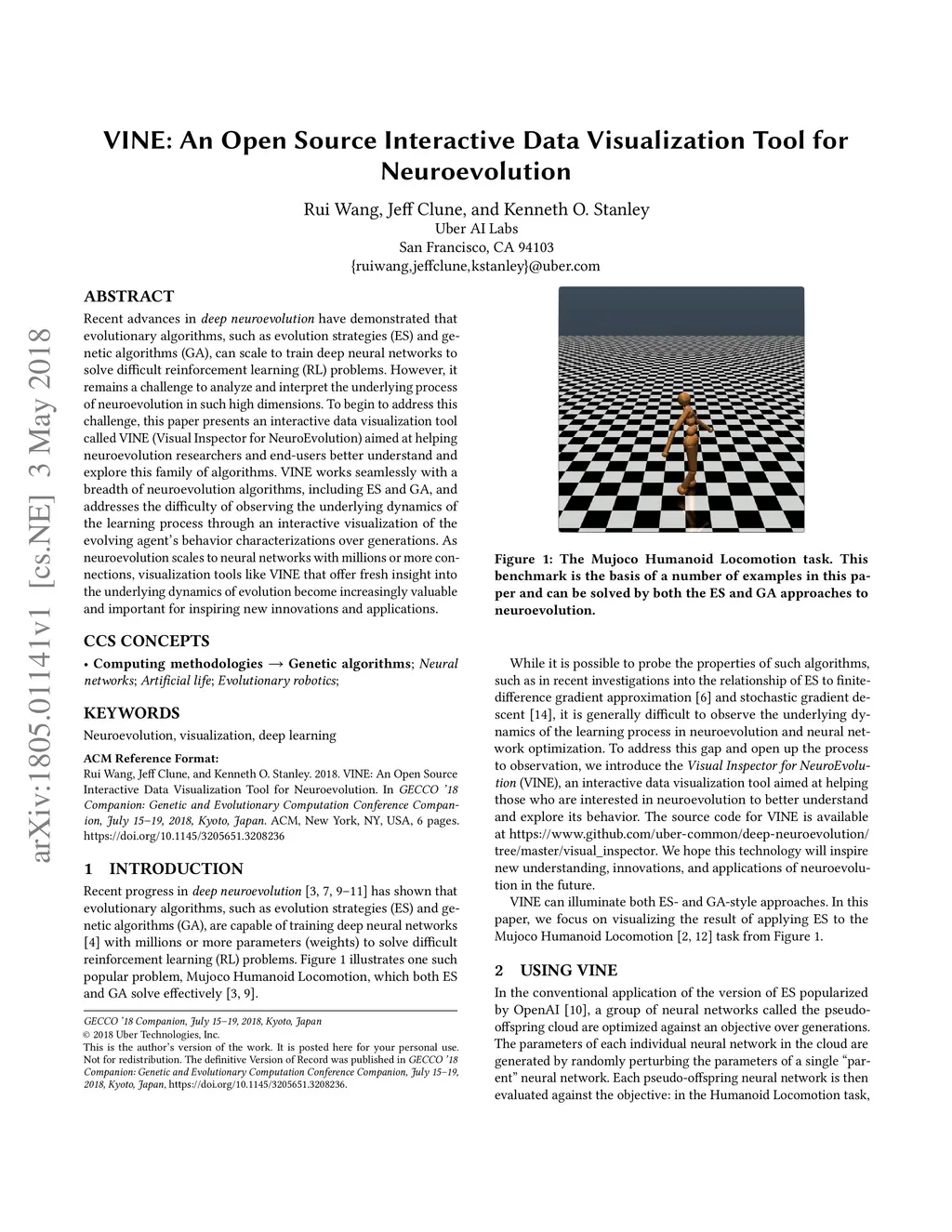 Recent advances in deep neuroevolution have demonstrated that evolutionary algorithms, such as evolution strategies (ES) and genetic algorithms (GA), can scale to train deep neural networks to solve difficult reinforcement learning (RL) problems. However, it remains a challenge to analyze and interpret the underlying process of neuroevolution in such high dimensions. To begin to address this challenge, this paper presents an interactive data visualization tool called VINE (Visual Inspector for NeuroEvolution) aimed at helping neuroevolution researchers and end-users better understand and explore this family of algorithms. VINE works seamlessly with a breadth of neuroevolution algorithms, including ES and GA, and addresses the difficulty of observing the underlying dynamics of the learning process through an interactive visualization of the evolving agent's behavior characterizations over generations. As neuroevolution scales to neural networks with millions or more connections, visualization tools like VINE that offer fresh insight into the underlying dynamics of evolution become increasingly valuable and important for inspiring new innovations and applications.