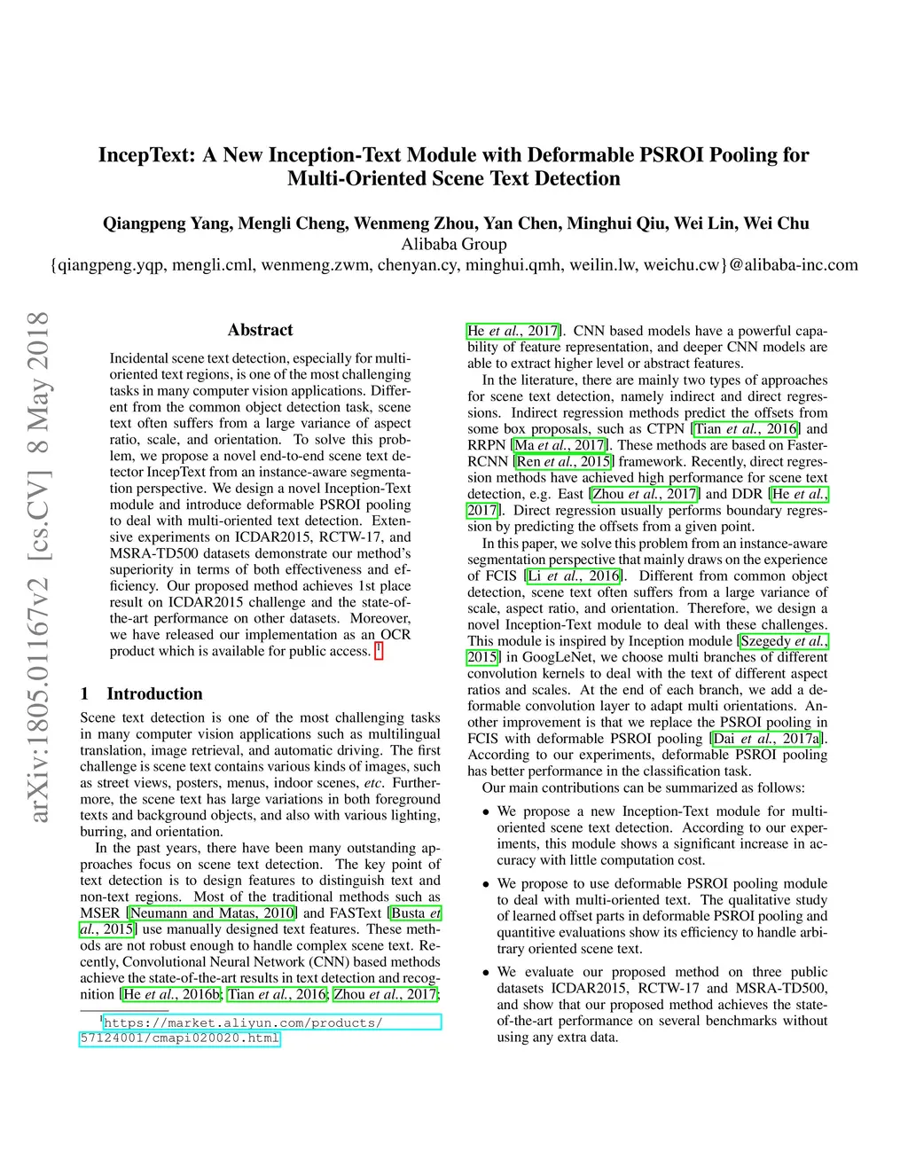 IncepText: A New Inception-Text Module with Deformable PSROI Pooling for