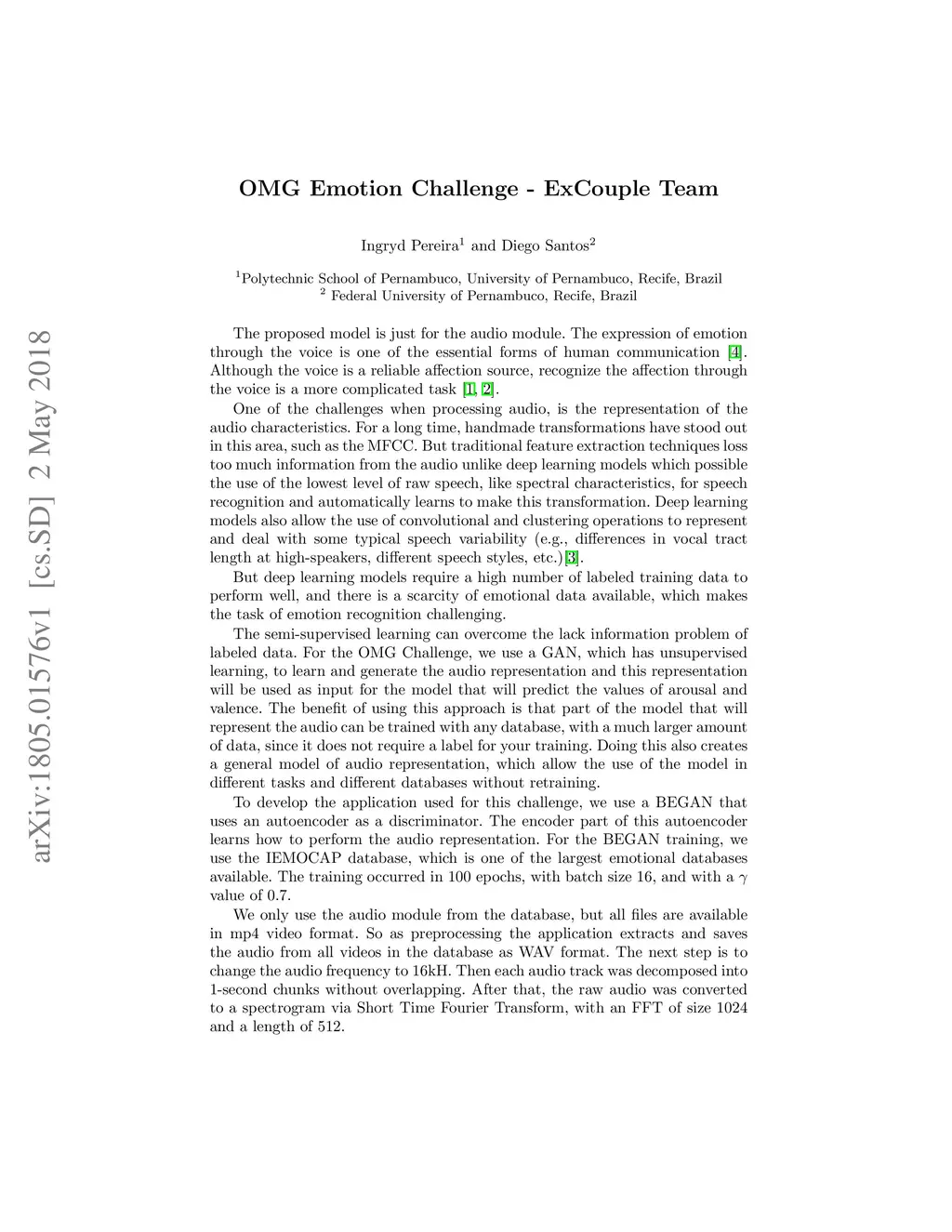 The proposed model is only for the audio module. All videos in the OMG Emotion Dataset are converted to WAV files. The proposed model makes use of semi-supervised learning for the emotion recognition. A GAN is trained with unsupervised learning, with another database (IEMOCAP), and part of the GAN structure (part of the autoencoder) will be used for the audio representation. The audio spectrogram will be extracted in 1-second windows of 16khz frequency, and this will serve as input to the model of audio representation trained with another database in an unsupervised way. This audio representation will serve as input to a convolutional network and a Dense layer with 'tanh' activation that performs the prediction of Arousal and Valence values. For joining the 1-second pieces of audio, the median of the predicted values of a given utterance will be taken.