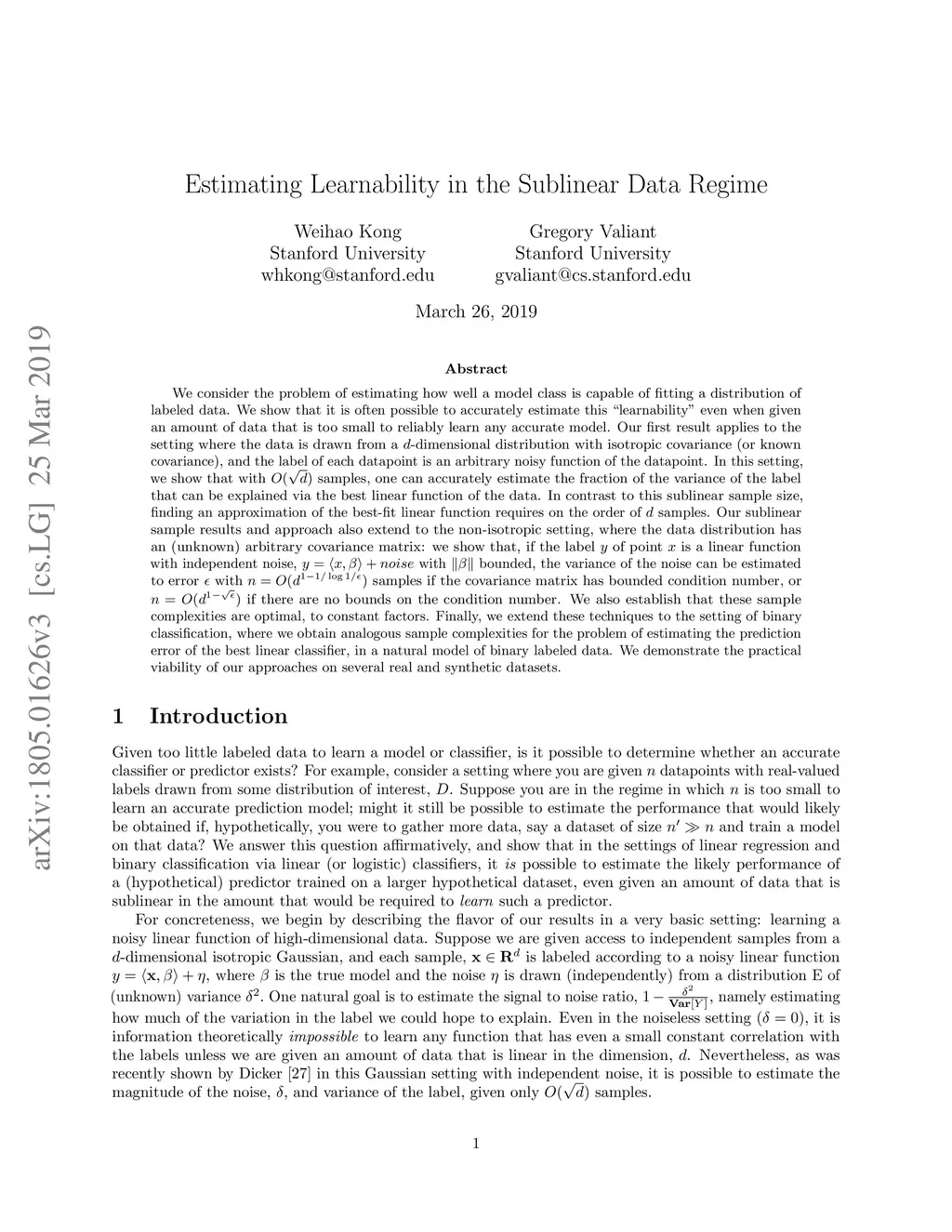We consider the problem of estimating how well a model class is capable of fitting a distribution of labeled data. We show that it is often possible to accurately estimate this "learnability" even when given an amount of data that is too small to reliably learn any accurate model. Our first result applies to the setting where the data is drawn from a -dimensional distribution with isotropic covariance (or known covariance), and the label of each datapoint is an arbitrary noisy function of the datapoint. In this setting, we show that with samples, one can accurately estimate the fraction of the variance of the label that can be explained via the best linear function of the data. In contrast to this sublinear sample size, finding an approximation of the best-fit linear function requires on the order of samples. Our sublinear sample results and approach also extend to the non-isotropic setting, where the data distribution has an (unknown) arbitrary covariance matrix: we show that, if the label of point is a linear function with independent noise, with bounded, the variance of the noise can be estimated to error with if the covariance matrix has bounded condition number, or if there are no bounds on the condition number. We also establish that these sample complexities are optimal, to constant factors. Finally, we extend these techniques to the setting of binary classification, where we obtain analogous sample complexities for the problem of estimating the prediction error of the best linear classifier, in a natural model of binary labeled data. We demonstrate the practical viability of our approaches on several real and synthetic datasets.