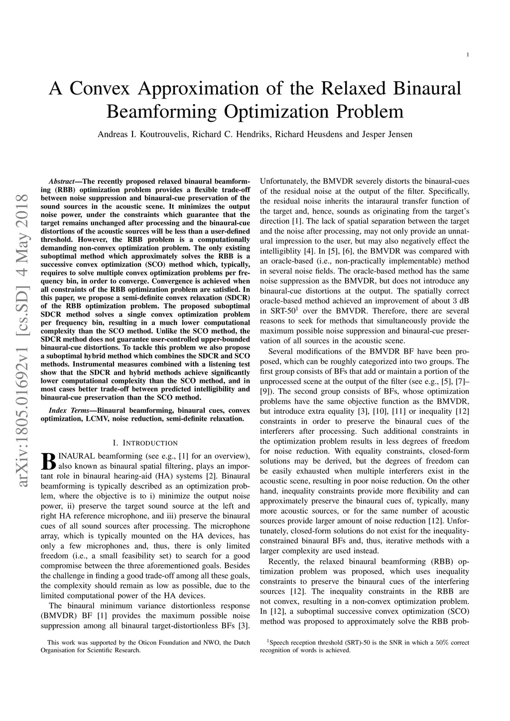 The recently proposed relaxed binaural beamforming (RBB) optimization problem provides a flexible trade-off between noise suppression and binaural-cue preservation of the sound sources in the acoustic scene. It minimizes the output noise power, under the constraints which guarantee that the target remains unchanged after processing and the binaural-cue distortions of the acoustic sources will be less than a user-defined threshold. However, the RBB problem is a computationally demanding non-convex optimization problem. The only existing suboptimal method which approximately solves the RBB is a successive convex optimization (SCO) method which, typically, requires to solve multiple convex optimization problems per frequency bin, in order to converge. Convergence is achieved when all constraints of the RBB optimization problem are satisfied. In this paper, we propose a semi-definite convex relaxation (SDCR) of the RBB optimization problem. The proposed suboptimal SDCR method solves a single convex optimization problem per frequency bin, resulting in a much lower computational complexity than the SCO method. Unlike the SCO method, the SDCR method does not guarantee user-controlled upper-bounded binaural-cue distortions. To tackle this problem we also propose a suboptimal hybrid method which combines the SDCR and SCO methods. Instrumental measures combined with a listening test show that the SDCR and hybrid methods achieve significantly lower computational complexity than the SCO method, and in most cases better trade-off between predicted intelligibility and binaural-cue preservation than the SCO method.