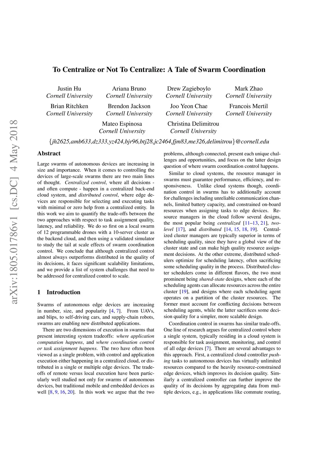 Large swarms of autonomous devices are increasing in size and importance. When it comes to controlling the devices of large-scale swarms there are two main lines of thought. Centralized control, where all decisions - and often compute - happen in a centralized back-end cloud system, and distributed control, where edge devices are responsible for selecting and executing tasks with minimal or zero help from a centralized entity. In this work we aim to quantify the trade-offs between the two approaches with respect to task assignment quality, latency, and reliability. We do so first on a local swarm of 12 programmable drones with a 10-server cluster as the backend cloud, and then using a validated simulator to study the tail at scale effects of swarm coordination control. We conclude that although centralized control almost always outperforms distributed in the quality of its decisions, it faces significant scalability limitations, and we provide a list of system challenges that need to be addressed for centralized control to scale.