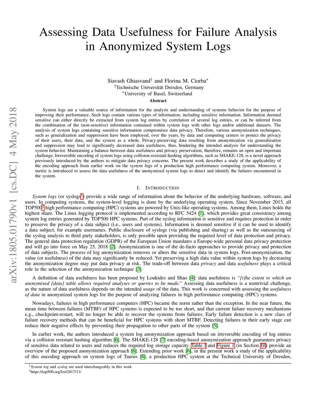 System logs are a valuable source of information for the analysis and understanding of systems behavior for the purpose of improving their performance. Such logs contain various types of information, including sensitive information. Information deemed sensitive can either directly be extracted from system log entries by correlation of several log entries, or can be inferred from the combination of the (non-sensitive) information contained within system logs with other logs and/or additional datasets. The analysis of system logs containing sensitive information compromises data privacy. Therefore, various anonymization techniques, such as generalization and suppression have been employed, over the years, by data and computing centers to protect the privacy of their users, their data, and the system as a whole. Privacy-preserving data resulting from anonymization via generalization and suppression may lead to significantly decreased data usefulness, thus, hindering the intended analysis for understanding the system behavior. Maintaining a balance between data usefulness and privacy preservation, therefore, remains an open and important challenge. Irreversible encoding of system logs using collision-resistant hashing algorithms, such as SHAKE-128, is a novel approach previously introduced by the authors to mitigate data privacy concerns. The present work describes a study of the applicability of the encoding approach from earlier work on the system logs of a production high performance computing system. Moreover, a metric is introduced to assess the data usefulness of the anonymized system logs to detect and identify the failures encountered in the system.
