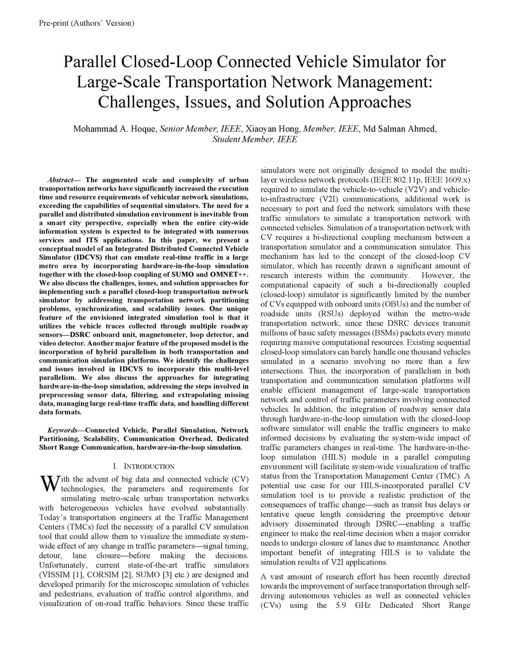 The augmented scale and complexity of urban transportation networks have significantly increased the execution time and resource requirements of vehicular network simulations, exceeding the capabilities of sequential simulators. The need for a parallel and distributed simulation environment is inevitable from a smart city perspective, especially when the entire city-wide information system is expected to be integrated with numerous services and ITS applications. In this paper, we present a conceptual model of an Integrated Distributed Connected Vehicle Simulator (IDCVS) that can emulate real-time traffic in a large metro area by incorporating hardware-in-the-loop simulation together with the closed-loop coupling of SUMO and OMNET++. We also discuss the challenges, issues, and solution approaches for implementing such a parallel closed-loop transportation network simulator by addressing transportation network partitioning problems, synchronization, and scalability issues. One unique feature of the envisioned integrated simulation tool is that it utilizes the vehicle traces collected through multiple roadway sensors-DSRC onboard unit, magnetometer, loop detector, and video detector. Another major feature of the proposed model is the incorporation of hybrid parallelism in both transportation and communication simulation platforms. We identify the challenges and issues involved in IDCVS to incorporate this multi-level parallelism. We also discuss the approaches for integrating hardware-in-the-loop simulation, addressing the steps involved in preprocessing sensor data, filtering, and extrapolating missing data, managing large real-time traffic data, and handling different data formats.