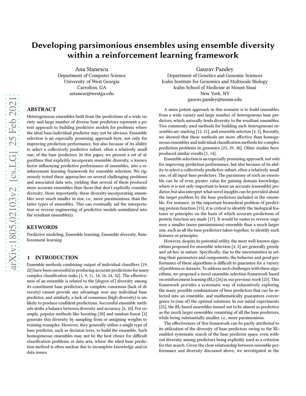 Developing parsimonious ensembles using ensemble diversity within a