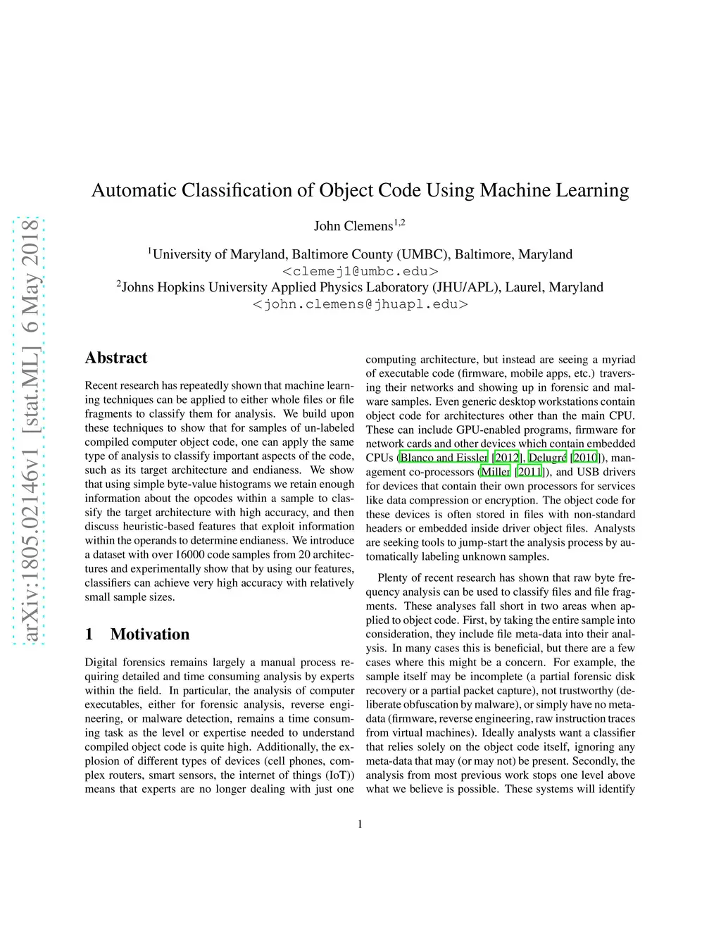 Automatic Classification of Object Code Using Machine Learning