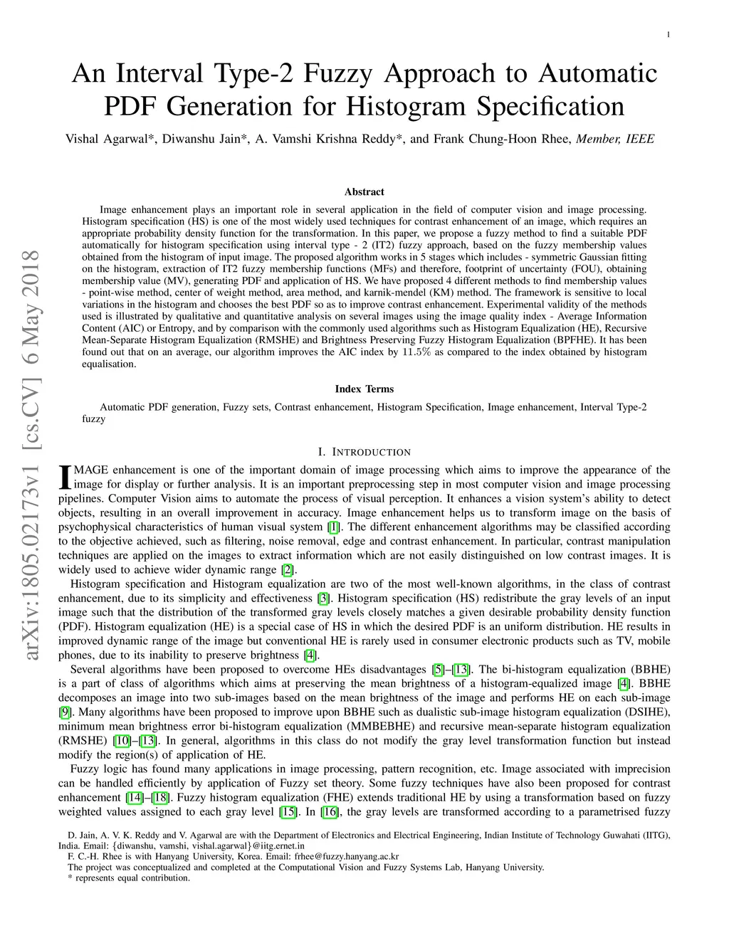 Image enhancement plays an important role in several application in the field of computer vision and image processing. Histogram specification (HS) is one of the most widely used techniques for contrast enhancement of an image, which requires an appropriate probability density function for the transformation. In this paper, we propose a fuzzy method to find a suitable PDF automatically for histogram specification using interval type - 2 (IT2) fuzzy approach, based on the fuzzy membership values obtained from the histogram of input image. The proposed algorithm works in 5 stages which includes - symmetric Gaussian fitting on the histogram, extraction of IT2 fuzzy membership functions (MFs) and therefore, footprint of uncertainty (FOU), obtaining membership value (MV), generating PDF and application of HS. We have proposed 4 different methods to find membership values - point-wise method, center of weight method, area method, and karnik-mendel (KM) method. The framework is sensitive to local variations in the histogram and chooses the best PDF so as to improve contrast enhancement. Experimental validity of the methods used is illustrated by qualitative and quantitative analysis on several images using the image quality index - Average Information Content (AIC) or Entropy, and by comparison with the commonly used algorithms such as Histogram Equalization (HE), Recursive Mean-Separate Histogram Equalization (RMSHE) and Brightness Preserving Fuzzy Histogram Equalization (BPFHE). It has been found out that on an average, our algorithm improves the AIC index by 11.5% as compared to the index obtained by histogram equalisation.
