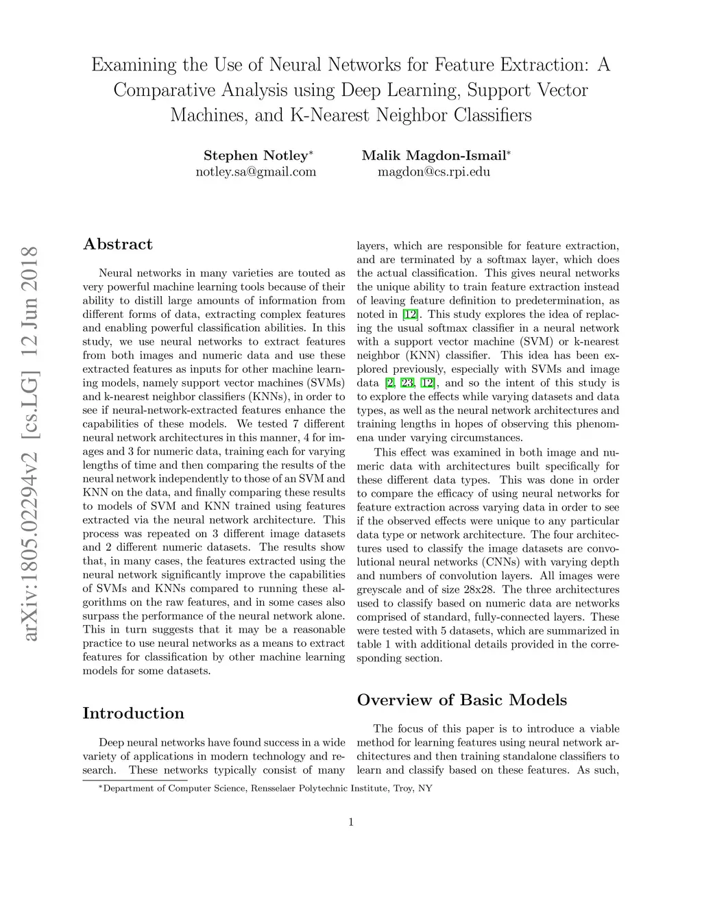 Neural networks in many varieties are touted as very powerful machine learning tools because of their ability to distill large amounts of information from different forms of data, extracting complex features and enabling powerful classification abilities. In this study, we use neural networks to extract features from both images and numeric data and use these extracted features as inputs for other machine learning models, namely support vector machines (SVMs) and k-nearest neighbor classifiers (KNNs), in order to see if neural-network-extracted features enhance the capabilities of these models. We tested 7 different neural network architectures in this manner, 4 for images and 3 for numeric data, training each for varying lengths of time and then comparing the results of the neural network independently to those of an SVM and KNN on the data, and finally comparing these results to models of SVM and KNN trained using features extracted via the neural network architecture. This process was repeated on 3 different image datasets and 2 different numeric datasets. The results show that, in many cases, the features extracted using the neural network significantly improve the capabilities of SVMs and KNNs compared to running these algorithms on the raw features, and in some cases also surpass the performance of the neural network alone. This in turn suggests that it may be a reasonable practice to use neural networks as a means to extract features for classification by other machine learning models for some datasets.
