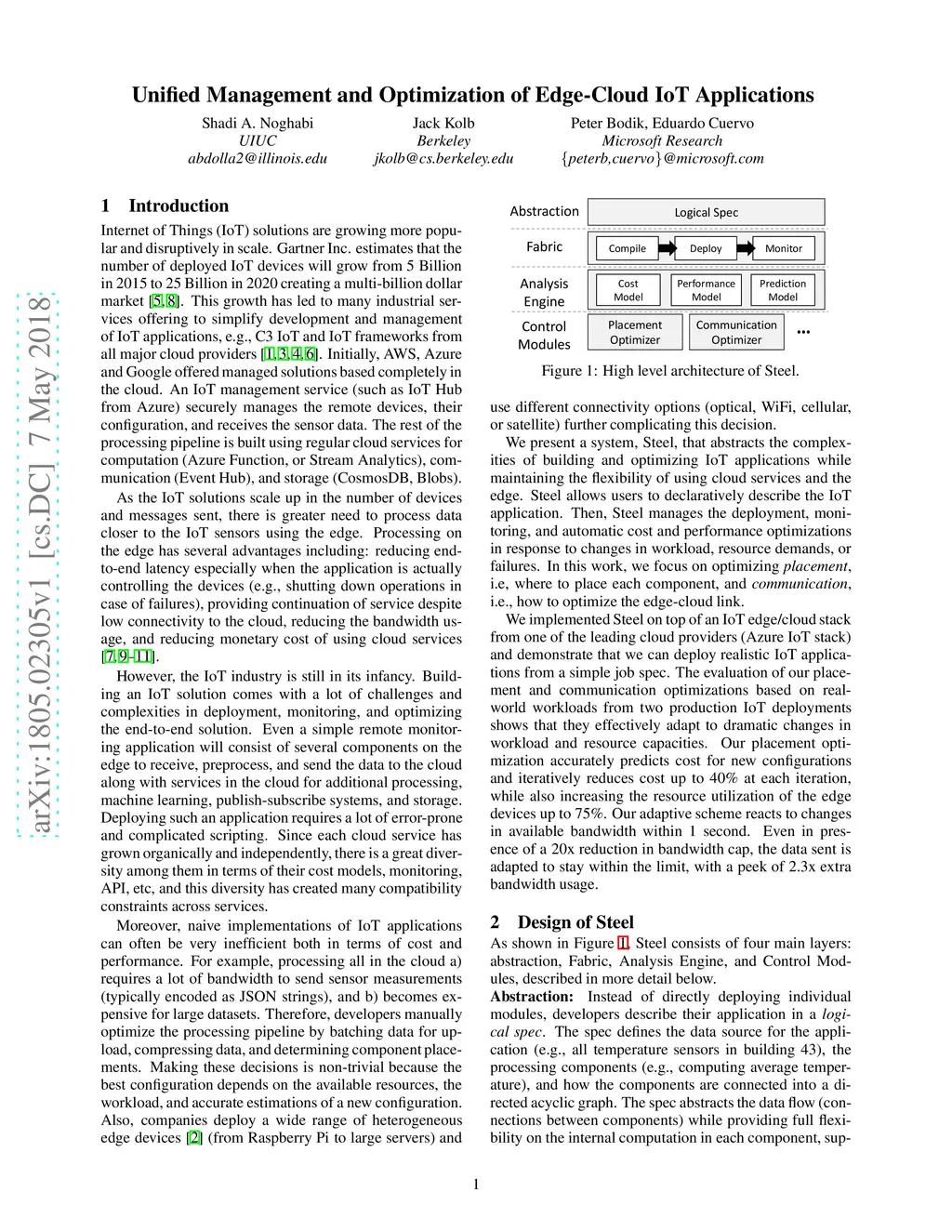Internet of Things (IoT) applications have seen a phenomenal growth with estimates of growing to a 25 Billion dollar industry by 2020. With the scale of IoT applications growing and stricter requirements on latency, edge computing has piqued the interest for such environments. However, the industry is still in its infancy with no proper support for applications running across the entire edge-cloud environment, and an array of manual tedious per-application optimizations. In this work, we propose Steel, a unified framework for developing, deploying, and monitoring applications in the edge-cloud. Steel supports dynamically adapting and easily moving services back and forth between the edge and the cloud. Steel is extensible where common optimizations (but crucial for the edge) can be built as pluggable and configurable modules. We have added two very common optimizations: placement and adaptive communication, to cope with both short and long-term changes in the workload and environment.