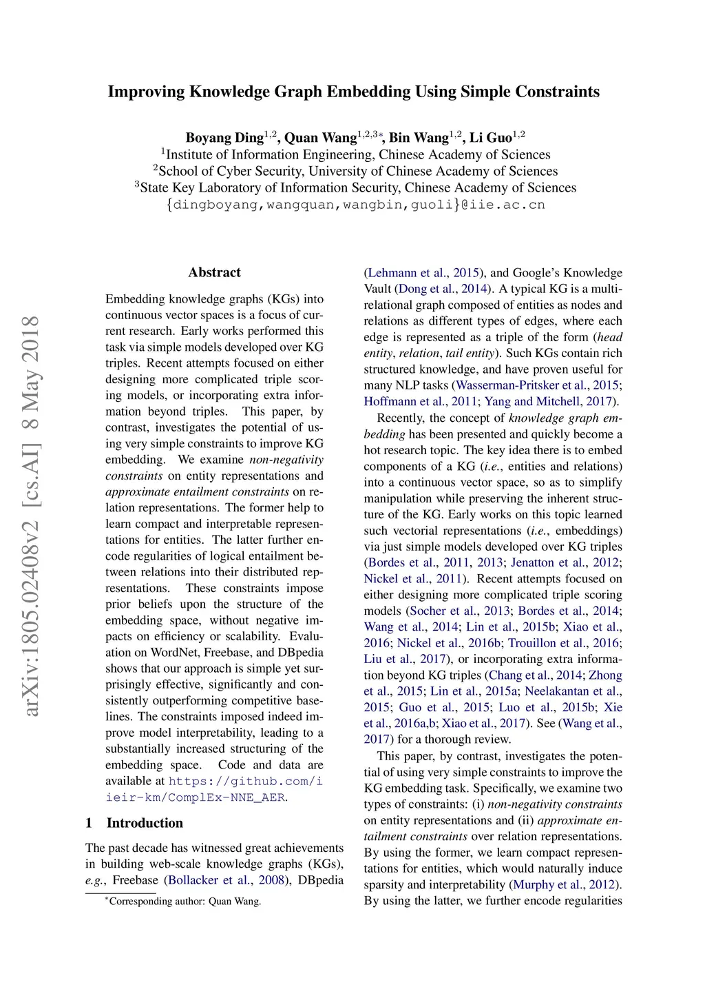 Improving Knowledge Graph Embedding Using Simple Constraints