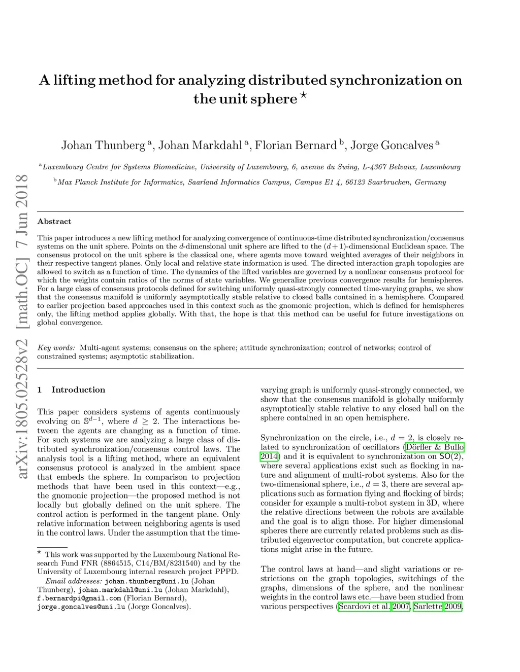 This paper introduces a new lifting method for analyzing convergence of continuous-time distributed synchronization/consensus systems on the unit sphere. Points on the d-dimensional unit sphere are lifted to the (d+1)-dimensional Euclidean space. The consensus protocol on the unit sphere is the classical one, where agents move toward weighted averages of their neighbors in their respective tangent planes. Only local and relative state information is used. The directed interaction graph topologies are allowed to switch as a function of time. The dynamics of the lifted variables are governed by a nonlinear consensus protocol for which the weights contain ratios of the norms of state variables. We generalize previous convergence results for hemispheres. For a large class of consensus protocols defined for switching uniformly quasi-strongly connected time-varying graphs, we show that the consensus manifold is uniformly asymptotically stable relative to closed balls contained in a hemisphere. Compared to earlier projection based approaches used in this context such as the gnomonic projection, which is defined for hemispheres only, the lifting method applies globally. With that, the hope is that this method can be useful for future investigations on global convergence.