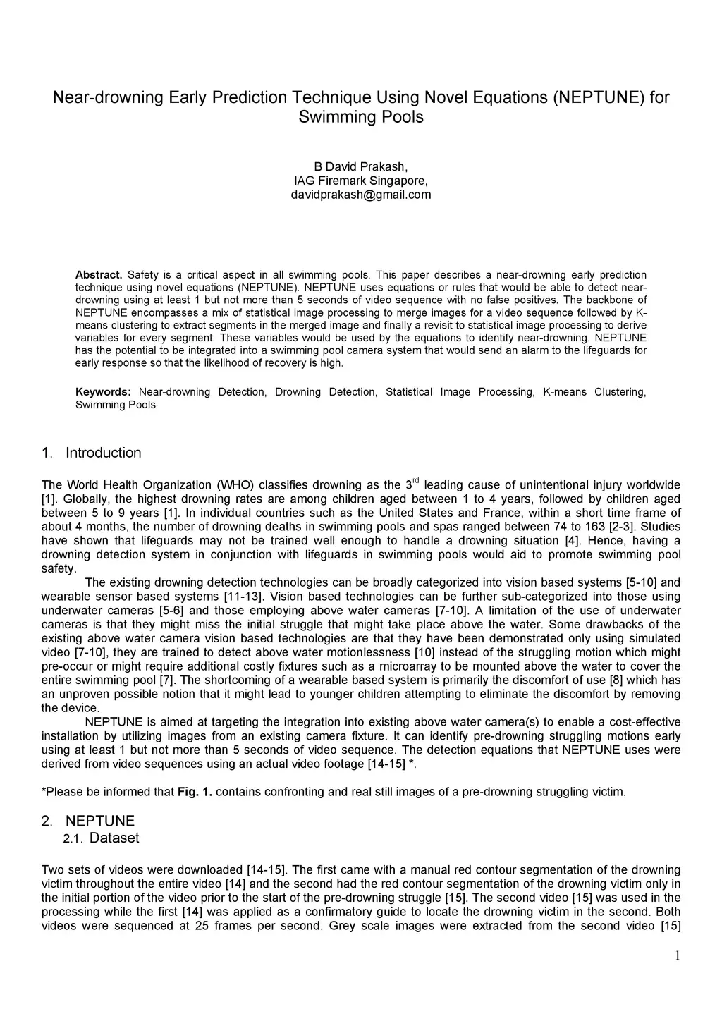 Safety is a critical aspect in all swimming pools. This paper describes a near drowning early prediction technique using novel equations (NEPTUNE). NEPTUNE uses equations or rules that would be able to detect near drowning using at least 1 but not more than 5 seconds of video sequence with no false positives. The backbone of NEPTUNE encompasses a mix of statistical image processing to merge images for a video sequence followed by K means clustering to extract segments in the merged image and finally a revisit to statistical image processing to derive variables for every segment. These variables would be used by the equations to identify near-drowning. NEPTUNE has the potential to be integrated into a swimming pool camera system that would send an alarm to the lifeguards for early response so that the likelihood of recovery is high.