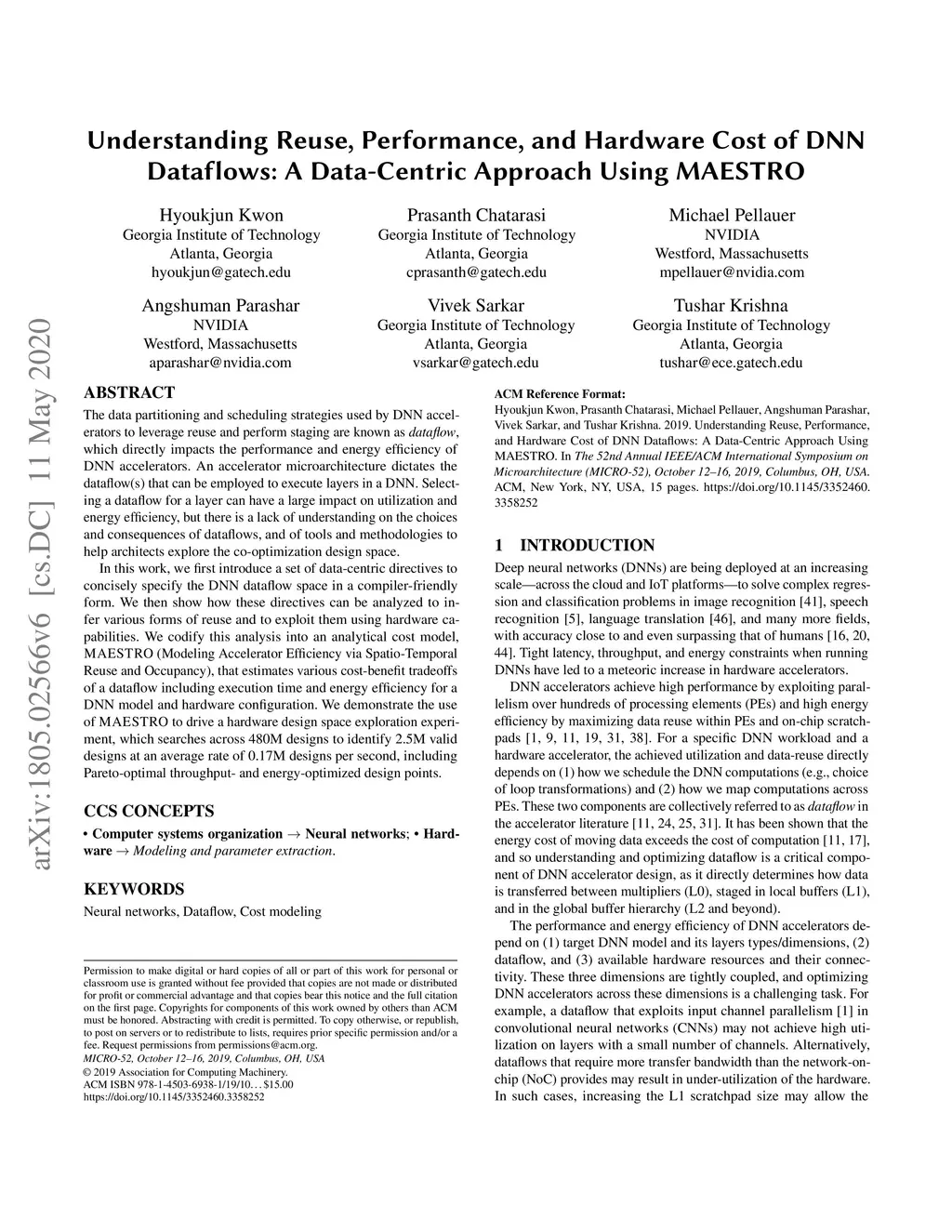The data partitioning and scheduling strategies used by DNN accelerators to leverage reuse and perform staging are known as dataflow, and they directly impact the performance and energy efficiency of DNN accelerator designs. An accelerator microarchitecture dictates the dataflow(s) that can be employed to execute a layer or network. Selecting an optimal dataflow for a layer shape can have a large impact on utilization and energy efficiency, but there is a lack of understanding on the choices and consequences of dataflows, and of tools and methodologies to help architects explore the co-optimization design space. In this work, we first introduce a set of data-centric directives to concisely specify the space of DNN dataflows in a compilerfriendly form. We then show how these directives can be analyzed to infer various forms of reuse and to exploit them using hardware capabilities. We codify this analysis into an analytical cost model, MAESTRO (Modeling Accelerator Efficiency via Spatio-Temporal Reuse and Occupancy), that estimates various cost-benefit tradeoffs of a dataflow including execution time and energy efficiency for a DNN model and hardware configuration. We demonstrate the use of MAESTRO to drive a hardware design space exploration (DSE) experiment, which searches across 480M designs to identify 2.5M valid designs at an average rate of 0.17M designs per second, including Pareto-optimal throughput- and energy-optimized design points.