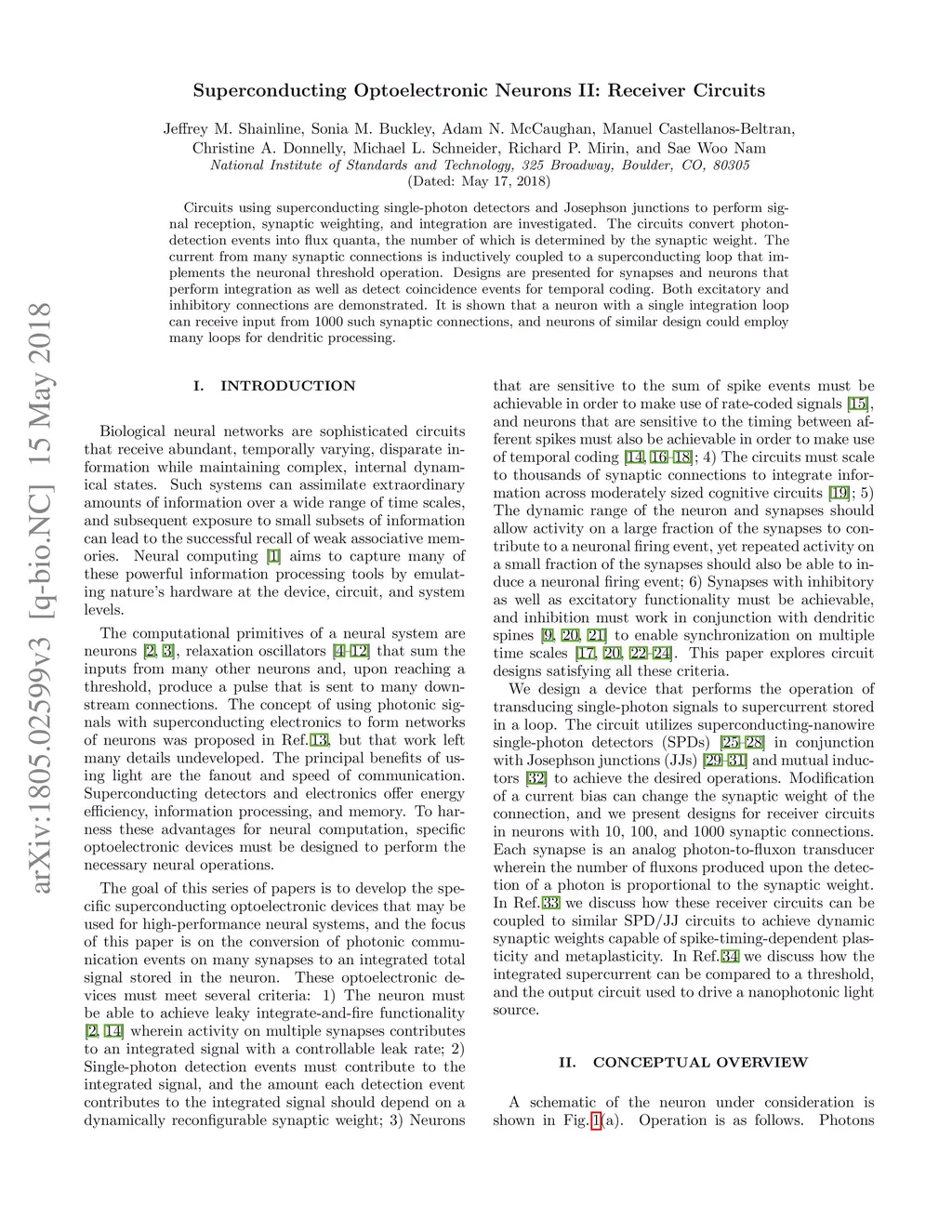 Circuits using superconducting single-photon detectors and Josephson junctions to perform signal reception, synaptic weighting, and integration are investigated. The circuits convert photon-detection events into flux quanta, the number of which is determined by the synaptic weight. The current from many synaptic connections is inductively coupled to a superconducting loop that implements the neuronal threshold operation. Designs are presented for synapses and neurons that perform integration as well as detect coincidence events for temporal coding. Both excitatory and inhibitory connections are demonstrated. It is shown that a neuron with a single integration loop can receive input from 1000 such synaptic connections, and neurons of similar design could employ many loops for dendritic processing.