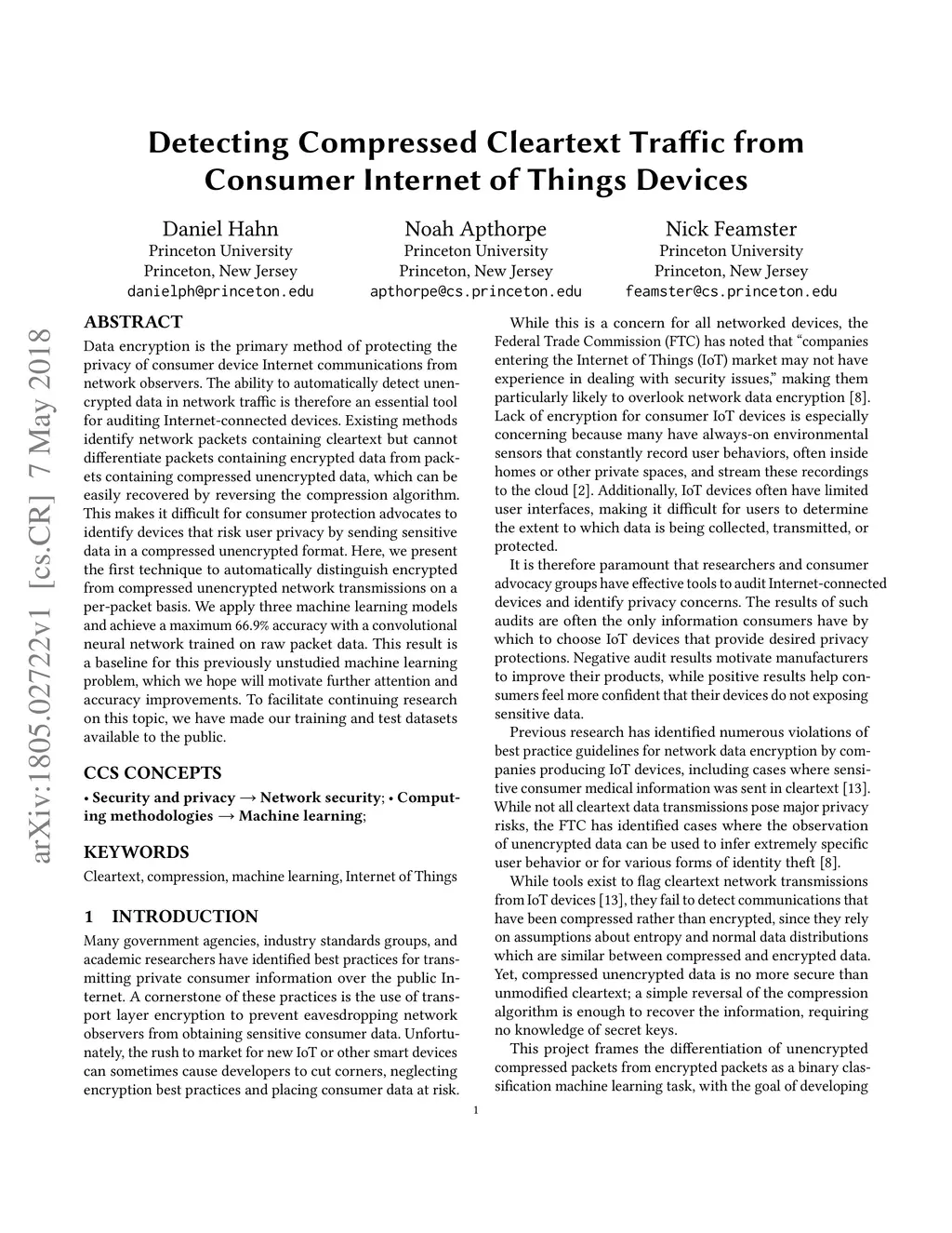 Detecting Compressed Cleartext Traffic from Consumer Internet of Things