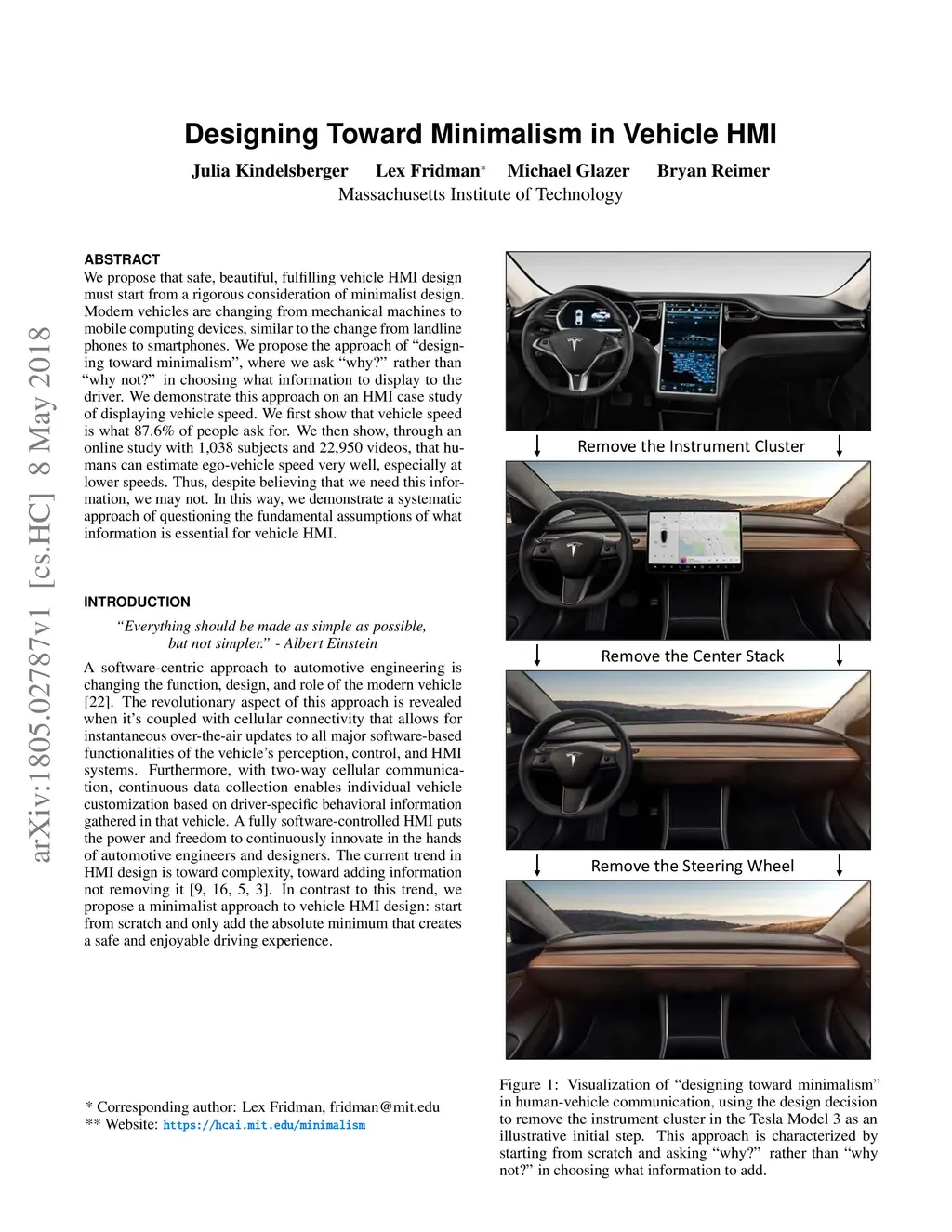 We propose that safe, beautiful, fulfilling vehicle HMI design must start from a rigorous consideration of minimalist design. Modern vehicles are changing from mechanical machines to mobile computing devices, similar to the change from landline phones to smartphones. We propose the approach of "designing toward minimalism", where we ask "why?" rather than "why not?" in choosing what information to display to the driver. We demonstrate this approach on an HMI case study of displaying vehicle speed. We first show that vehicle speed is what 87.6% of people ask for. We then show, through an online study with 1,038 subjects and 22,950 videos, that humans can estimate ego-vehicle speed very well, especially at lower speeds. Thus, despite believing that we need this information, we may not. In this way, we demonstrate a systematic approach of questioning the fundamental assumptions of what information is essential for vehicle HMI.