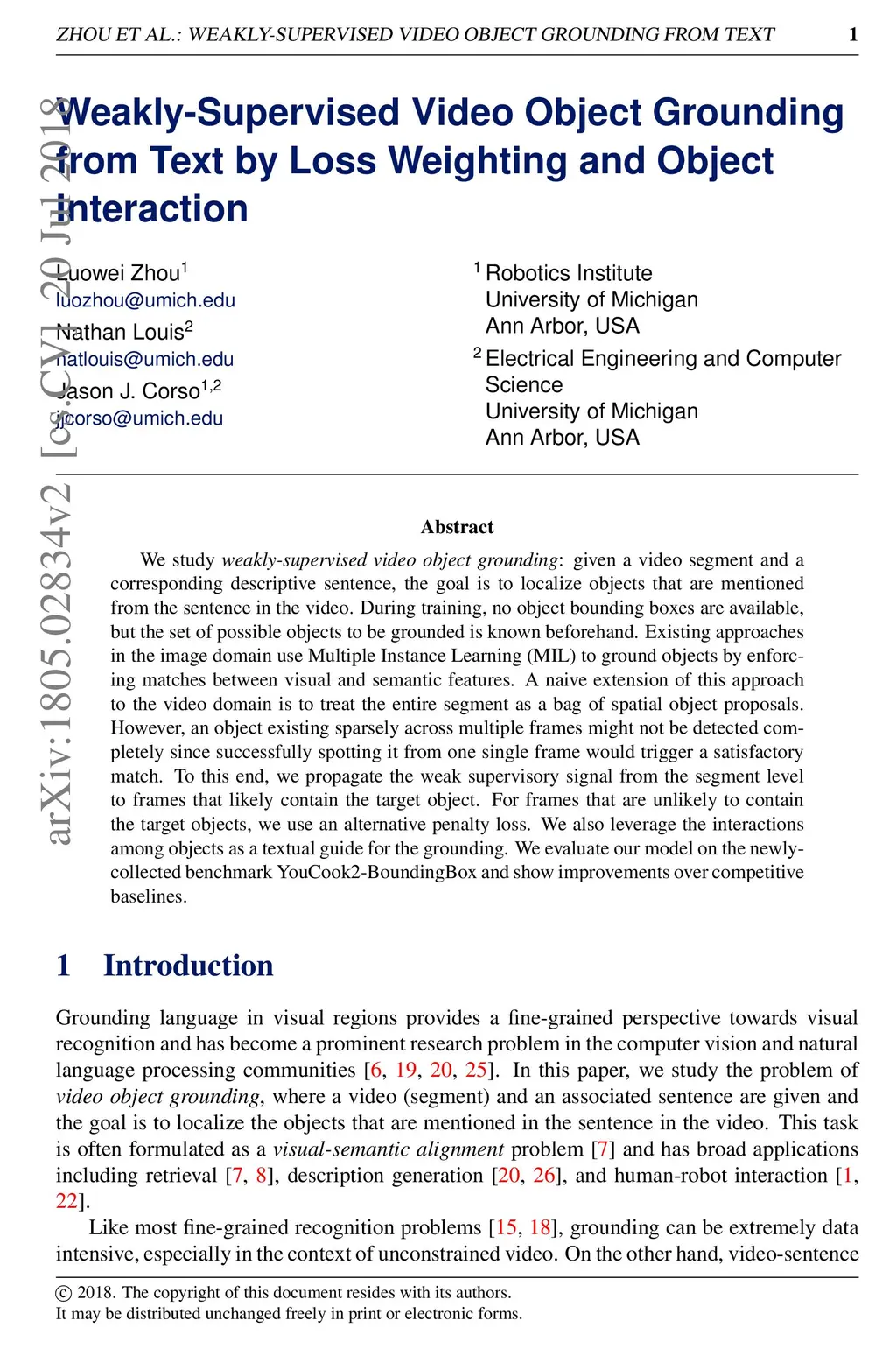 We study weakly-supervised video object grounding: given a video segment and a corresponding descriptive sentence, the goal is to localize objects that are mentioned from the sentence in the video. During training, no object bounding boxes are available, but the set of possible objects to be grounded is known beforehand. Existing approaches in the image domain use Multiple Instance Learning (MIL) to ground objects by enforcing matches between visual and semantic features. A naive extension of this approach to the video domain is to treat the entire segment as a bag of spatial object proposals. However, an object existing sparsely across multiple frames might not be detected completely since successfully spotting it from one single frame would trigger a satisfactory match. To this end, we propagate the weak supervisory signal from the segment level to frames that likely contain the target object. For frames that are unlikely to contain the target objects, we use an alternative penalty loss. We also leverage the interactions among objects as a textual guide for the grounding. We evaluate our model on the newly-collected benchmark YouCook2-BoundingBox and show improvements over competitive baselines.