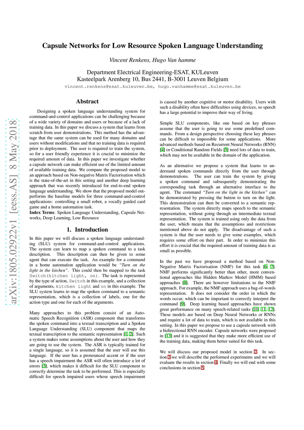 Designing a spoken language understanding system for command-and-control applications can be challenging because of a wide variety of domains and users or because of a lack of training data. In this paper we discuss a system that learns from scratch from user demonstrations. This method has the advantage that the same system can be used for many domains and users without modifications and that no training data is required prior to deployment. The user is required to train the system, so for a user friendly experience it is crucial to minimize the required amount of data. In this paper we investigate whether a capsule network can make efficient use of the limited amount of available training data. We compare the proposed model to an approach based on Non-negative Matrix Factorisation which is the state-of-the-art in this setting and another deep learning approach that was recently introduced for end-to-end spoken language understanding. We show that the proposed model outperforms the baseline models for three command-and-control applications: controlling a small robot, a vocally guided card game and a home automation task.
