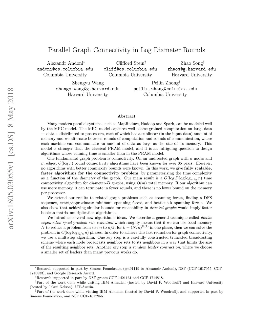 We study graph connectivity problem in MPC model. On an undirected graph with nodes and edges, round connectivity algorithms have been known for over 35 years. However, no algorithms with better complexity bounds were known. In this work, we give fully scalable, faster algorithms for the connectivity problem, by parameterizing the time complexity as a function of the diameter of the graph. Our main result is a time connectivity algorithm for diameter- graphs, using total memory. If our algorithm can use more memory, it can terminate in fewer rounds, and there is no lower bound on the memory per processor. We extend our results to related graph problems such as spanning forest, finding a DFS sequence, exact/approximate minimum spanning forest, and bottleneck spanning forest. We also show that achieving similar bounds for reachability in directed graphs would imply faster boolean matrix multiplication algorithms. We introduce several new algorithmic ideas. We describe a general technique called double exponential speed problem size reduction which roughly means that if we can use total memory to reduce a problem from size to , for in one phase, then we can solve the problem in phases. In order to achieve this fast reduction for graph connectivity, we use a multistep algorithm. One key step is a carefully constructed truncated broadcasting scheme where each node broadcasts neighbor sets to its neighbors in a way that limits the size of the resulting neighbor sets. Another key step is random leader contraction, where we choose a smaller set of leaders than many previous works do.