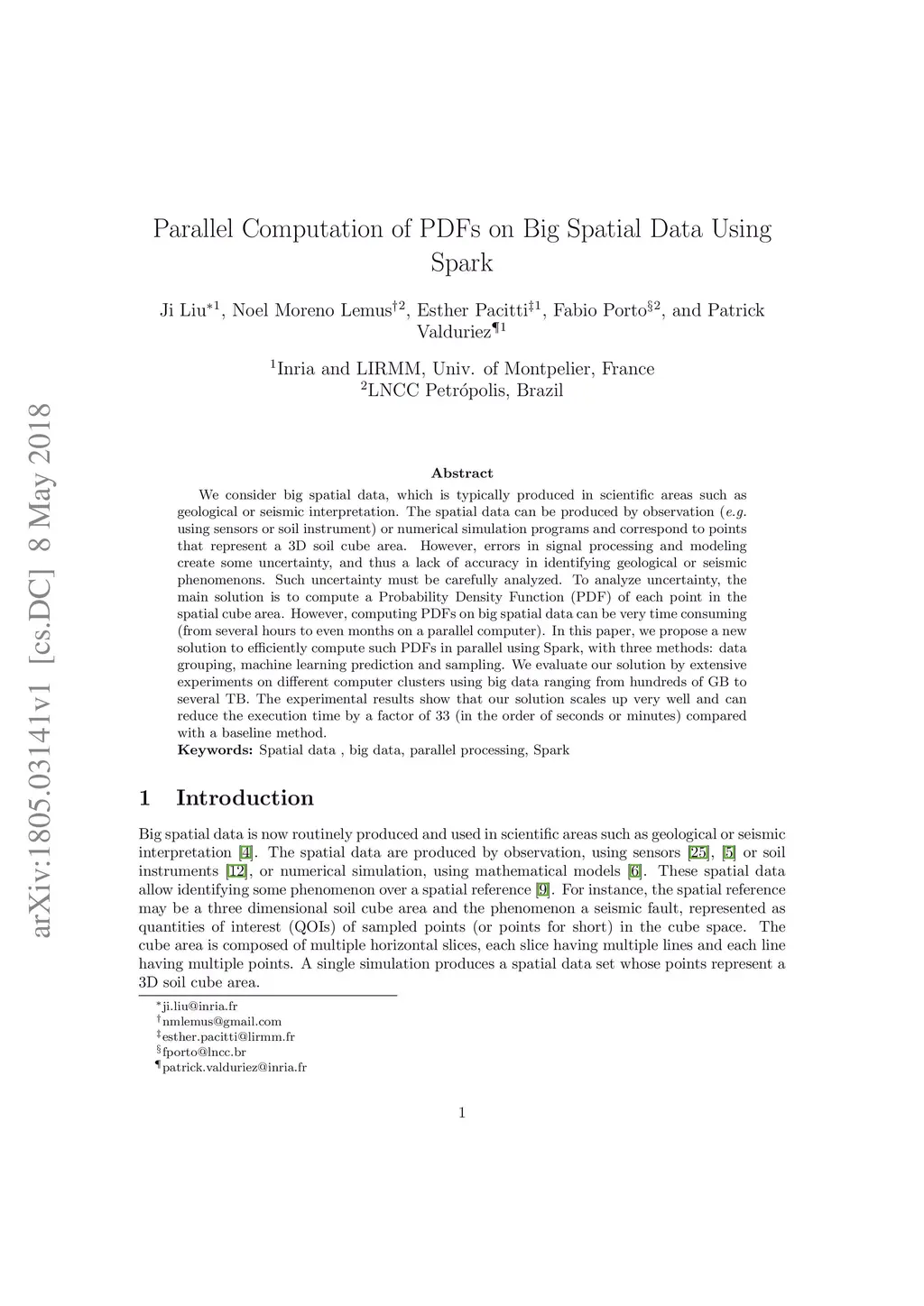 We consider big spatial data, which is typically produced in scientific areas such as geological or seismic interpretation. The spatial data can be produced by observation (e.g. using sensors or soil instrument) or numerical simulation programs and correspond to points that represent a 3D soil cube area. However, errors in signal processing and modeling create some uncertainty, and thus a lack of accuracy in identifying geological or seismic phenomenons. Such uncertainty must be carefully analyzed. To analyze uncertainty, the main solution is to compute a Probability Density Function (PDF) of each point in the spatial cube area. However, computing PDFs on big spatial data can be very time consuming (from several hours to even months on a parallel computer). In this paper, we propose a new solution to efficiently compute such PDFs in parallel using Spark, with three methods: data grouping, machine learning prediction and sampling. We evaluate our solution by extensive experiments on different computer clusters using big data ranging from hundreds of GB to several TB. The experimental results show that our solution scales up very well and can reduce the execution time by a factor of 33 (in the order of seconds or minutes) compared with a baseline method.