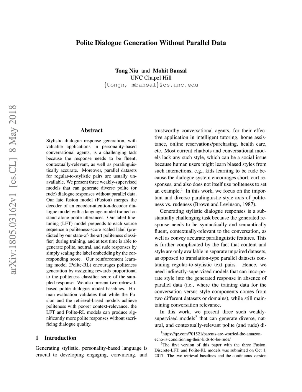 Polite Dialogue Generation Without Parallel Data
