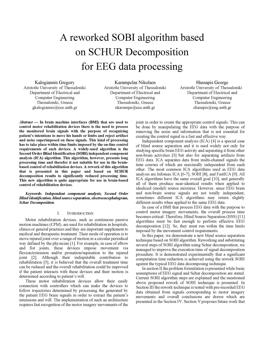 In brain machine interfaces (BMI) that are used to control motor rehabilitation devices there is the need to process the monitored brain signals with the purpose of recognizing patient's intentions to move his hands or limbs and reject artifact and noise superimposed on these signals. This kind of processing has to take place within time limits imposed by the on-line control requirements of such devices. A widely-used algorithm is the Second Order Blind Identification (SOBI) independent component analysis (ICA) algorithm. This algorithm, however, presents long processing time and therefor it not suitable for use in the brain-based control of rehabilitation devices. A rework of this algorithm that is presented in this paper and based on SCHUR decomposition results to significantly reduced processing time. This new algorithm is quite appropriate for use in brain-based control of rehabilitation devices.