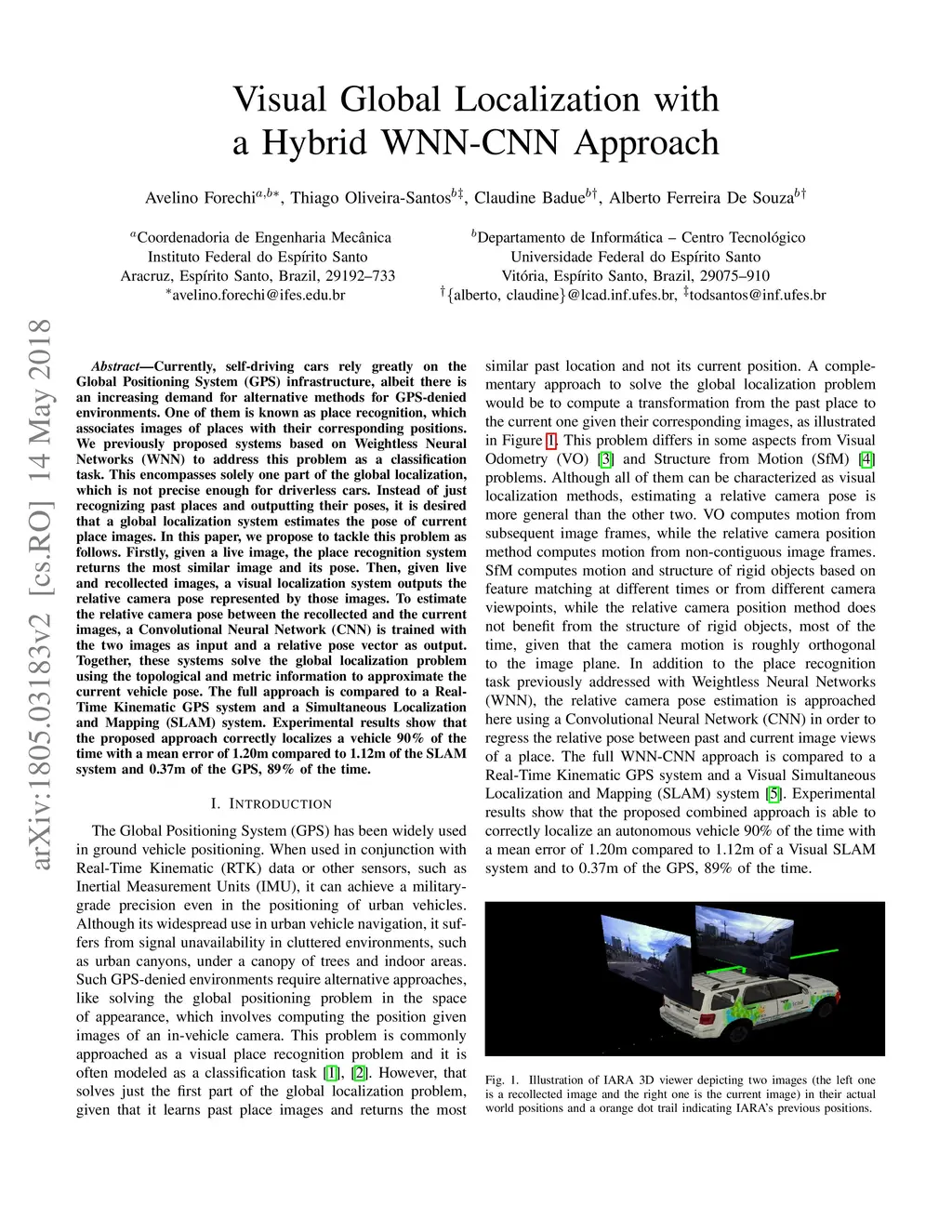 Currently, self-driving cars rely greatly on the Global Positioning System (GPS) infrastructure, albeit there is an increasing demand for alternative methods for GPS-denied environments. One of them is known as place recognition, which associates images of places with their corresponding positions. We previously proposed systems based on Weightless Neural Networks (WNN) to address this problem as a classification task. This encompasses solely one part of the global localization, which is not precise enough for driverless cars. Instead of just recognizing past places and outputting their poses, it is desired that a global localization system estimates the pose of current place images. In this paper, we propose to tackle this problem as follows. Firstly, given a live image, the place recognition system returns the most similar image and its pose. Then, given live and recollected images, a visual localization system outputs the relative camera pose represented by those images. To estimate the relative camera pose between the recollected and the current images, a Convolutional Neural Network (CNN) is trained with the two images as input and a relative pose vector as output. Together, these systems solve the global localization problem using the topological and metric information to approximate the current vehicle pose. The full approach is compared to a Real- Time Kinematic GPS system and a Simultaneous Localization and Mapping (SLAM) system. Experimental results show that the proposed approach correctly localizes a vehicle 90% of the time with a mean error of 1.20m compared to 1.12m of the SLAM system and 0.37m of the GPS, 89% of the time.