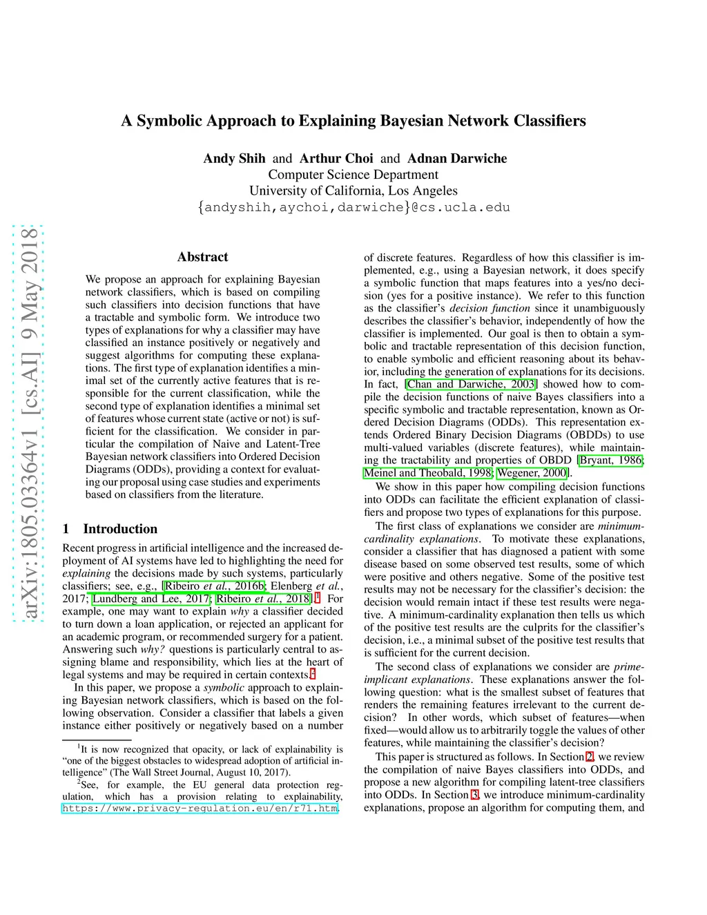 We propose an approach for explaining Bayesian network classifiers, which is based on compiling such classifiers into decision functions that have a tractable and symbolic form. We introduce two types of explanations for why a classifier may have classified an instance positively or negatively and suggest algorithms for computing these explanations. The first type of explanation identifies a minimal set of the currently active features that is responsible for the current classification, while the second type of explanation identifies a minimal set of features whose current state (active or not) is sufficient for the classification. We consider in particular the compilation of Naive and Latent-Tree Bayesian network classifiers into Ordered Decision Diagrams (ODDs), providing a context for evaluating our proposal using case studies and experiments based on classifiers from the literature.