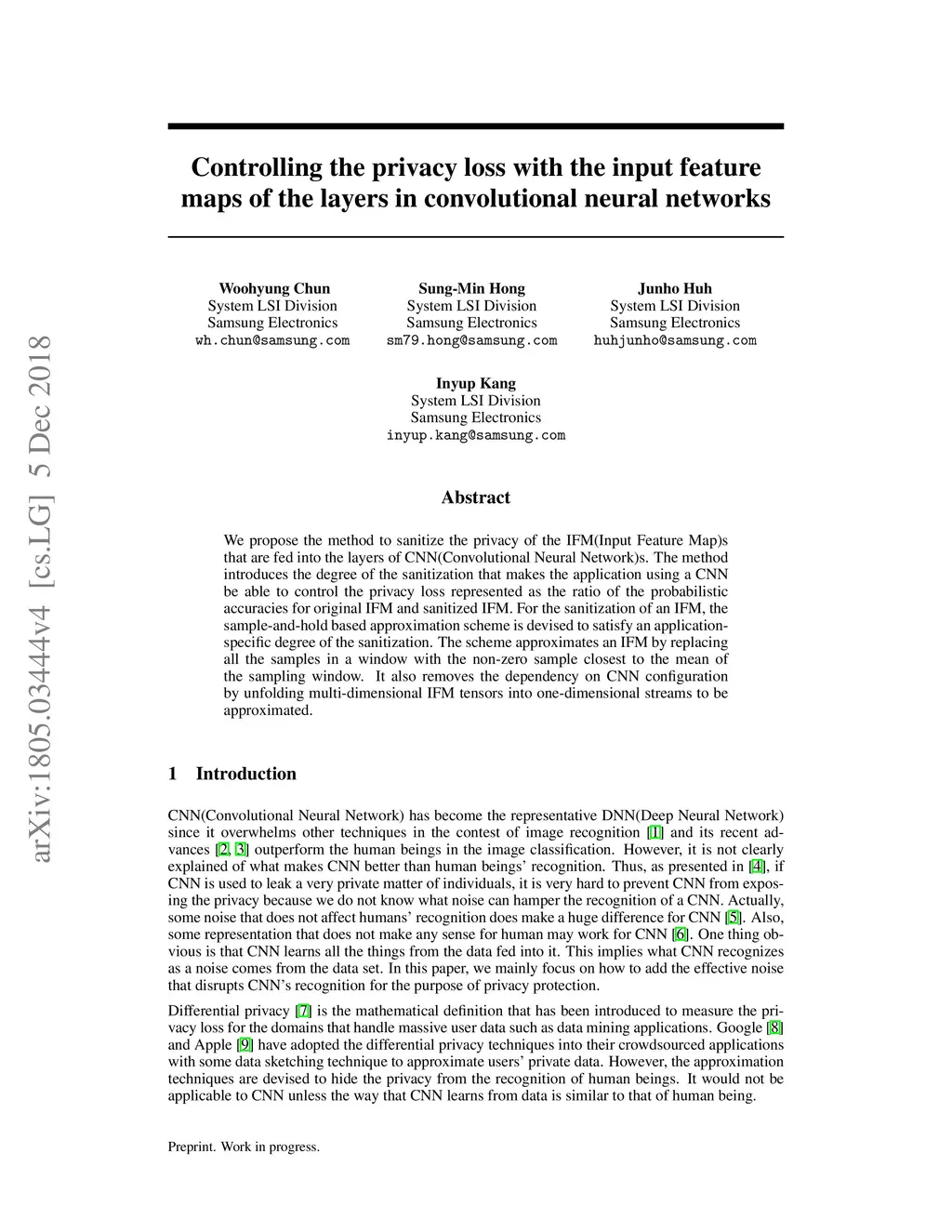 We propose the method to sanitize the privacy of the IFM(Input Feature Map)s that are fed into the layers of CNN(Convolutional Neural Network)s. The method introduces the degree of the sanitization that makes the application using a CNN be able to control the privacy loss represented as the ratio of the probabilistic accuracies for original IFM and sanitized IFM. For the sanitization of an IFM, the sample-and-hold based approximation scheme is devised to satisfy an application-specific degree of the sanitization. The scheme approximates an IFM by replacing all the samples in a window with the non-zero sample closest to the mean of the sampling window. It also removes the dependency on CNN configuration by unfolding multi-dimensional IFM tensors into one-dimensional streams to be approximated.