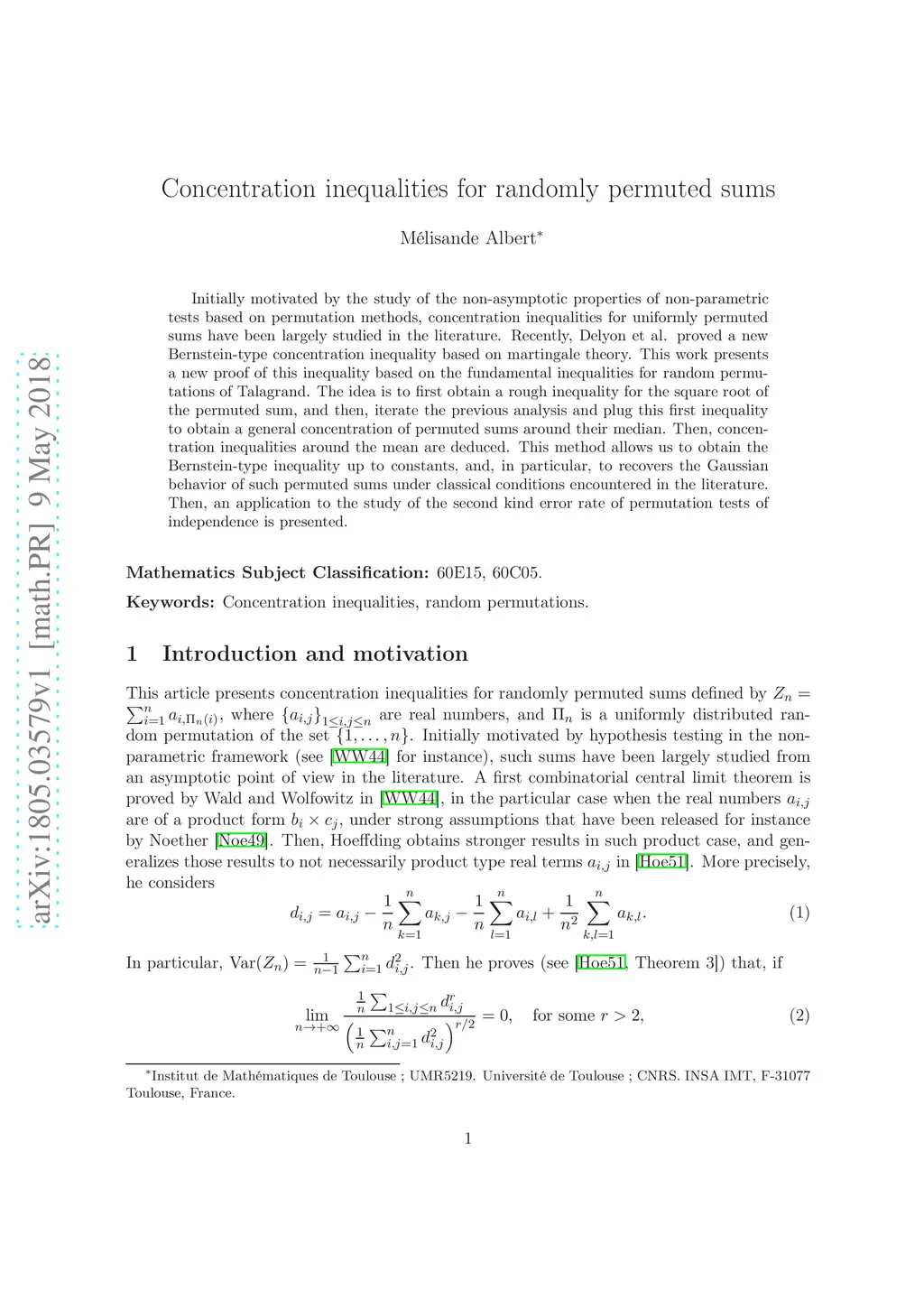Initially motivated by the study of the non-asymptotic properties of non-parametric tests based on permutation methods, concentration inequalities for uniformly permuted sums have been largely studied in the literature. Recently, Delyon et al. proved a new Bernstein-type concentration inequality based on martingale theory. This work presents a new proof of this inequality based on the fundamental inequalities for random permutations of Talagrand. The idea is to first obtain a rough inequality for the square root of the permuted sum, and then, iterate the previous analysis and plug this first inequality to obtain a general concentration of permuted sums around their median. Then, concentration inequalities around the mean are deduced. This method allows us to obtain the Bernstein-type inequality up to constants, and, in particular, to recovers the Gaussian behavior of such permuted sums under classical conditions encountered in the literature. Then, an application to the study of the second kind error rate of permutation tests of independence is presented.