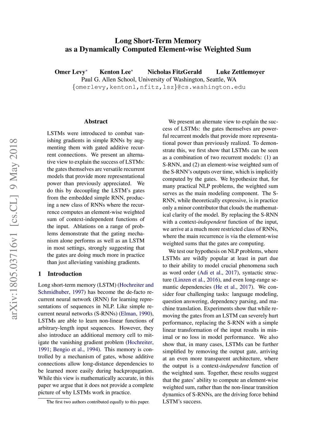 Long Short-Term Memory as a Dynamically Computed Element-wise Weighted