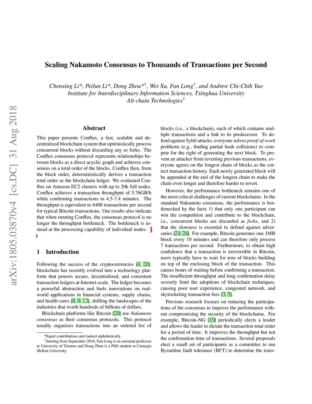This paper presents Conflux, a fast, scalable and decentralized blockchain system that optimistically process concurrent blocks without discarding any as forks. The Conflux consensus protocol represents relationships between blocks as a direct acyclic graph and achieves consensus on a total order of the blocks. Conflux then, from the block order, deterministically derives a transaction total order as the blockchain ledger. We evaluated Conflux on Amazon EC2 clusters with up to 20k full nodes. Conflux achieves a transaction throughput of 5.76GB/h while confirming transactions in 4.5-7.4 minutes. The throughput is equivalent to 6400 transactions per second for typical Bitcoin transactions. Our results also indicate that when running Conflux, the consensus protocol is no longer the throughput bottleneck. The bottleneck is instead at the processing capability of individual nodes.