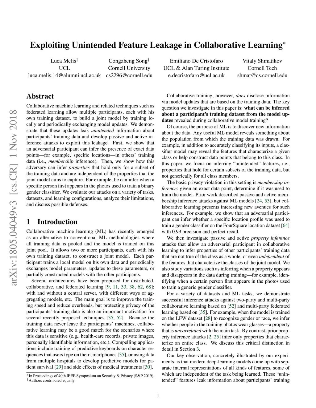 Collaborative machine learning and related techniques such as federated learning allow multiple participants, each with his own training dataset, to build a joint model by training locally and periodically exchanging model updates. We demonstrate that these updates leak unintended information about participants' training data and develop passive and active inference attacks to exploit this leakage. First, we show that an adversarial participant can infer the presence of exact data points -- for example, specific locations -- in others' training data (i.e., membership inference). Then, we show how this adversary can infer properties that hold only for a subset of the training data and are independent of the properties that the joint model aims to capture. For example, he can infer when a specific person first appears in the photos used to train a binary gender classifier. We evaluate our attacks on a variety of tasks, datasets, and learning configurations, analyze their limitations, and discuss possible defenses.