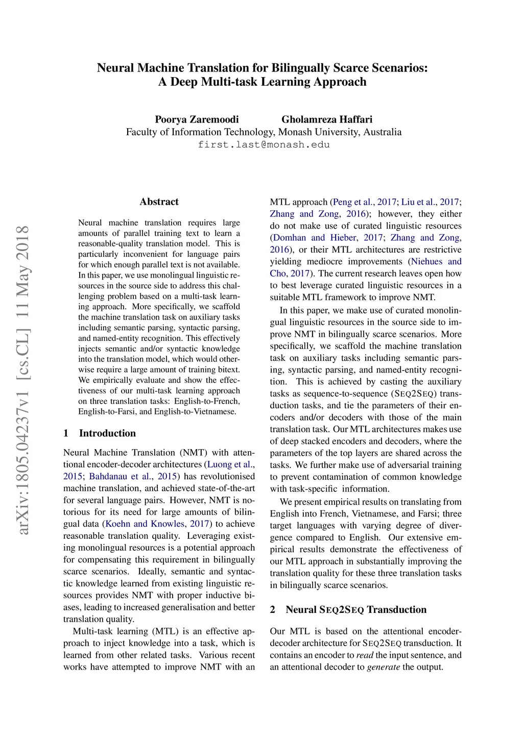 Neural machine translation requires large amounts of parallel training text to learn a reasonable-quality translation model. This is particularly inconvenient for language pairs for which enough parallel text is not available. In this paper, we use monolingual linguistic resources in the source side to address this challenging problem based on a multi-task learning approach. More specifically, we scaffold the machine translation task on auxiliary tasks including semantic parsing, syntactic parsing, and named-entity recognition. This effectively injects semantic and/or syntactic knowledge into the translation model, which would otherwise require a large amount of training bitext. We empirically evaluate and show the effectiveness of our multi-task learning approach on three translation tasks: English-to-French, English-to-Farsi, and English-to-Vietnamese.