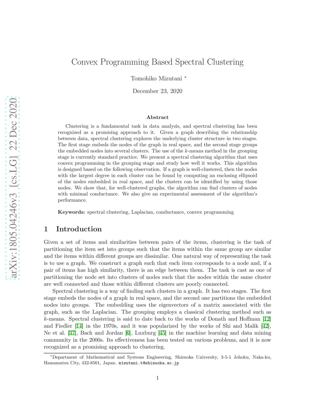 Clustering is a fundamental task in data analysis, and spectral clustering has been recognized as a promising approach to it. Given a graph describing the relationship between data, spectral clustering explores the underlying cluster structure in two stages. The first stage embeds the nodes of the graph into real space, and the second stage groups the embedded nodes into several clusters. The use of the -means method in the grouping stage is currently standard practice. We present a spectral clustering algorithm that uses convex programming in the grouping stage, and study how well it works. The concept behind the algorithm design lies in the following observation. The nodes with the largest degree in each cluster may be found by computing an enclosing ellipsoid for embedded nodes in real space, and the clusters may be identified by using those nodes. We show that the observations are valid, and the algorithm returns clusters to provide the conductance of graph, if the gap assumption, introduced by Peng el al. at COLT 2015, is satisfied. We also give an experimental assessment of the algorithm's performance.