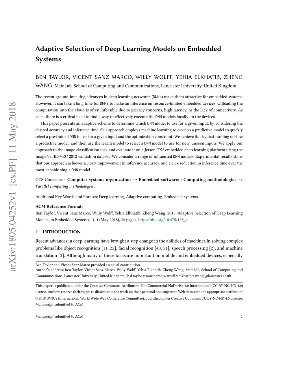 The recent ground-breaking advances in deep learning networks ( DNNs ) make them attractive for embedded systems. However, it can take a long time for DNNs to make an inference on resource-limited embedded devices. Offloading the computation into the cloud is often infeasible due to privacy concerns, high latency, or the lack of connectivity. As such, there is a critical need to find a way to effectively execute the DNN models locally on the devices. This paper presents an adaptive scheme to determine which DNN model to use for a given input, by considering the desired accuracy and inference time. Our approach employs machine learning to develop a predictive model to quickly select a pre-trained DNN to use for a given input and the optimization constraint. We achieve this by first training off-line a predictive model, and then use the learnt model to select a DNN model to use for new, unseen inputs. We apply our approach to the image classification task and evaluate it on a Jetson TX2 embedded deep learning platform using the ImageNet ILSVRC 2012 validation dataset. We consider a range of influential DNN models. Experimental results show that our approach achieves a 7.52% improvement in inference accuracy, and a 1.8x reduction in inference time over the most-capable single DNN model.