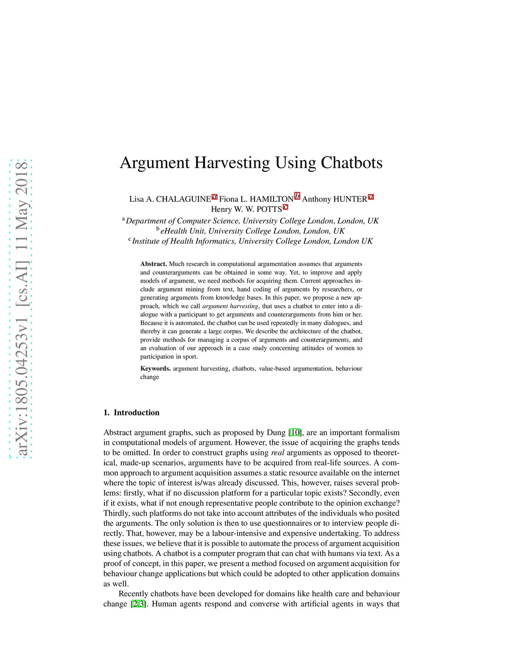 Much research in computational argumentation assumes that arguments and counterarguments can be obtained in some way. Yet, to improve and apply models of argument, we need methods for acquiring them. Current approaches include argument mining from text, hand coding of arguments by researchers, or generating arguments from knowledge bases. In this paper, we propose a new approach, which we call argument harvesting, that uses a chatbot to enter into a dialogue with a participant to get arguments and counterarguments from him or her. Because it is automated, the chatbot can be used repeatedly in many dialogues, and thereby it can generate a large corpus. We describe the architecture of the chatbot, provide methods for managing a corpus of arguments and counterarguments, and an evaluation of our approach in a case study concerning attitudes of women to participation in sport.
