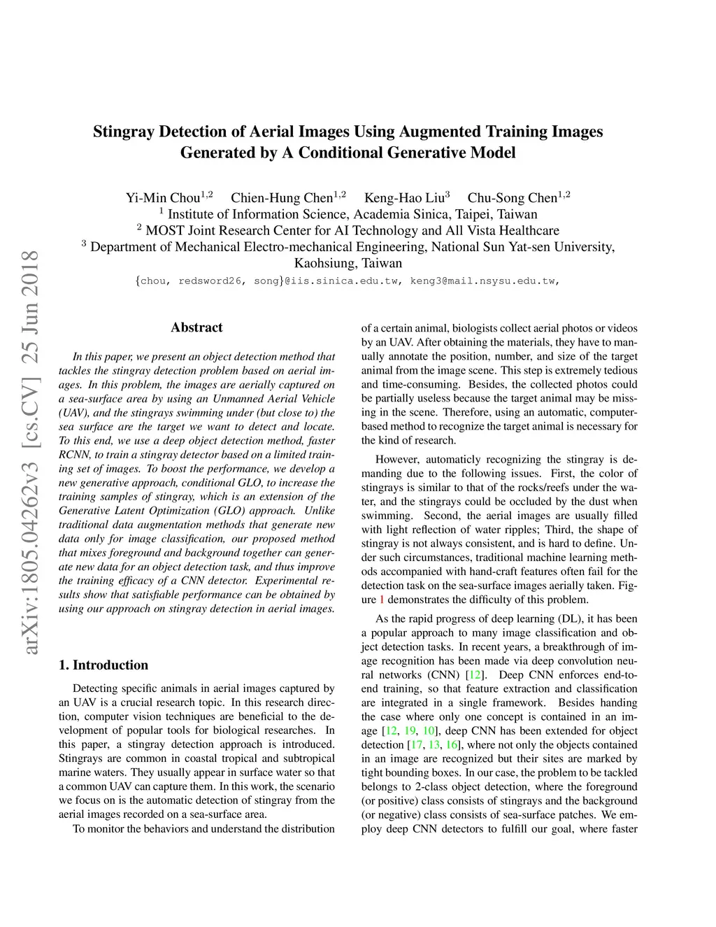 In this paper, we present an object detection method that tackles the stingray detection problem based on aerial images. In this problem, the images are aerially captured on a sea-surface area by using an Unmanned Aerial Vehicle (UAV), and the stingrays swimming under (but close to) the sea surface are the target we want to detect and locate. To this end, we use a deep object detection method, faster RCNN, to train a stingray detector based on a limited training set of images. To boost the performance, we develop a new generative approach, conditional GLO, to increase the training samples of stingray, which is an extension of the Generative Latent Optimization (GLO) approach. Unlike traditional data augmentation methods that generate new data only for image classification, our proposed method that mixes foreground and background together can generate new data for an object detection task, and thus improve the training efficacy of a CNN detector. Experimental results show that satisfiable performance can be obtained by using our approach on stingray detection in aerial images.