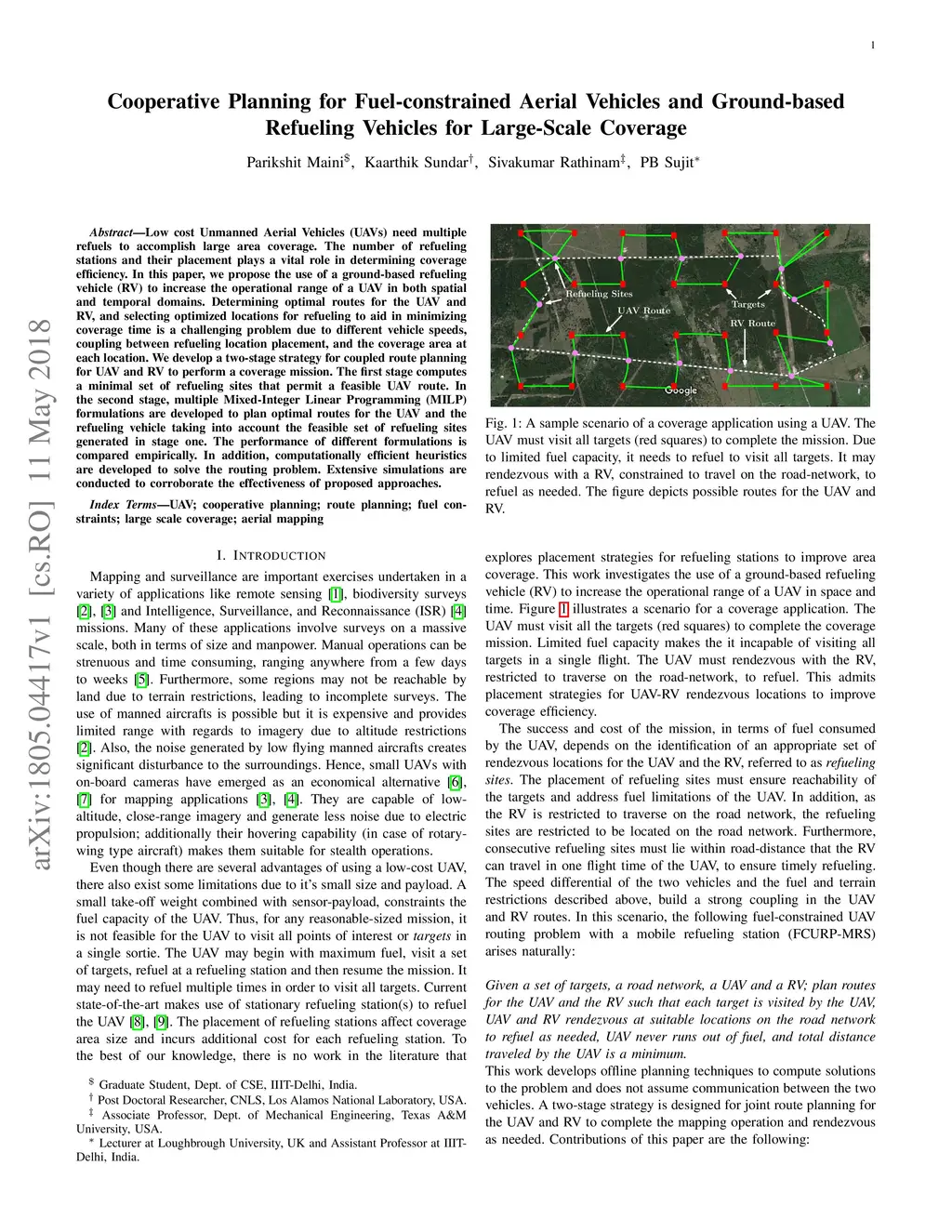Low cost Unmanned Aerial Vehicles (UAVs) need multiple refuels to accomplish large area coverage. The number of refueling stations and their placement plays a vital role in determining coverage efficiency. In this paper, we propose the use of a ground-based refueling vehicle (RV) to increase the operational range of a UAV in both spatial and temporal domains. Determining optimal routes for the UAV and RV, and selecting optimized locations for refueling to aid in minimizing coverage time is a challenging problem due to different vehicle speeds, coupling between refueling location placement, and the coverage area at each location. We develop a two-stage strategy for coupled route planning for UAV and RV to perform a coverage mission. The first stage computes a minimal set of refueling sites that permit a feasible UAV route. In the second stage, multiple Mixed-Integer Linear Programming (MILP) formulations are developed to plan optimal routes for the UAV and the refueling vehicle taking into account the feasible set of refueling sites generated in stage one. The performance of different formulations is compared empirically. In addition, computationally efficient heuristics are developed to solve the routing problem. Extensive simulations are conducted to corroborate the effectiveness of proposed approaches.