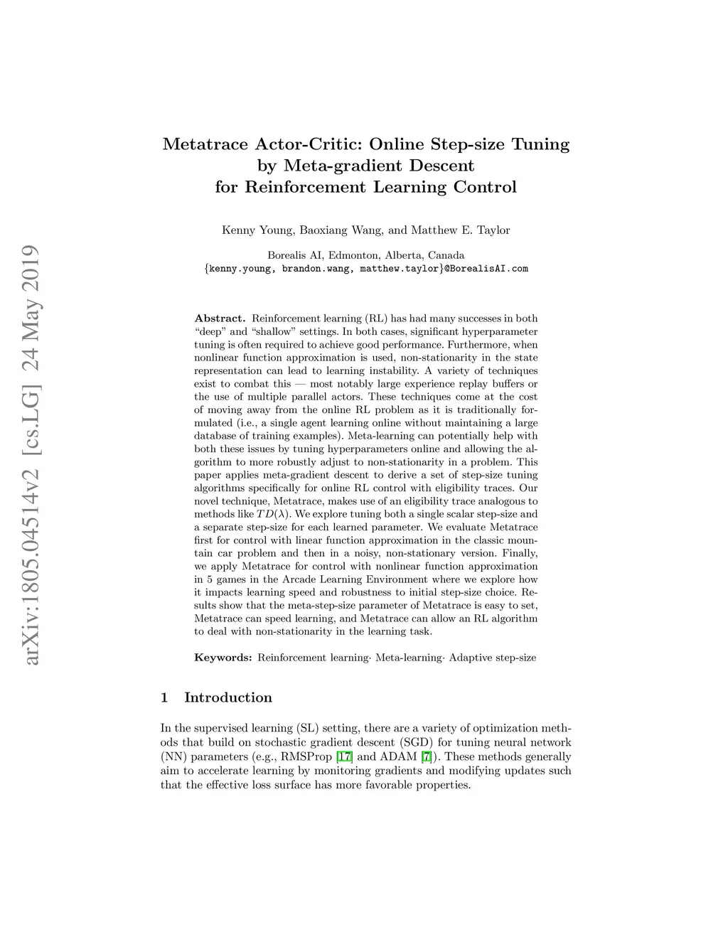 Reinforcement learning (RL) has had many successes in both "deep" and "shallow" settings. In both cases, significant hyperparameter tuning is often required to achieve good performance. Furthermore, when nonlinear function approximation is used, non-stationarity in the state representation can lead to learning instability. A variety of techniques exist to combat this --- most notably large experience replay buffers or the use of multiple parallel actors. These techniques come at the cost of moving away from the online RL problem as it is traditionally formulated (i.e., a single agent learning online without maintaining a large database of training examples). Meta-learning can potentially help with both these issues by tuning hyperparameters online and allowing the algorithm to more robustly adjust to non-stationarity in a problem. This paper applies meta-gradient descent to derive a set of step-size tuning algorithms specifically for online RL control with eligibility traces. Our novel technique, Metatrace, makes use of an eligibility trace analogous to methods like . We explore tuning both a single scalar step-size and a separate step-size for each learned parameter. We evaluate Metatrace first for control with linear function approximation in the classic mountain car problem and then in a noisy, non-stationary version. Finally, we apply Metatrace for control with nonlinear function approximation in 5 games in the Arcade Learning Environment where we explore how it impacts learning speed and robustness to initial step-size choice. Results show that the meta-step-size parameter of Metatrace is easy to set, Metatrace can speed learning, and Metatrace can allow an RL algorithm to deal with non-stationarity in the learning task.