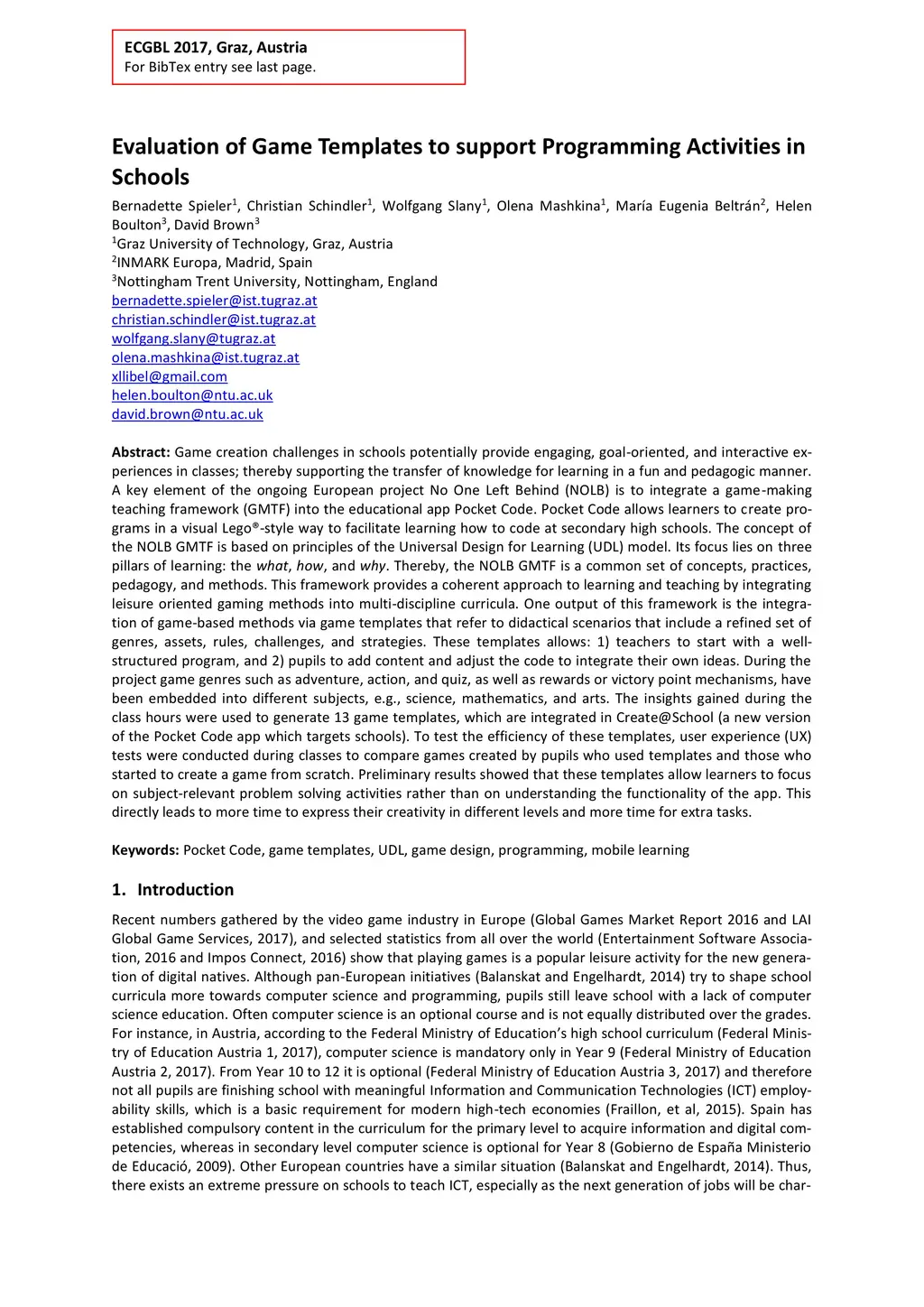 Game creation challenges in schools potentially provide engaging, goal-oriented, and interactive experiences in classes; thereby supporting the transfer of knowledge for learning in a fun and pedagogic manner. A key element of the ongoing European project No One Left Behind (NOLB) is to integrate a game-making teaching framework (GMTF) into the educational app Pocket Code. Pocket Code allows learners to create programs in a visual Lego-style way to facilitate learning how to code at secondary high schools. The concept of the NOLB GMTF is based on principles of the Universal Design for Learning (UDL) model. This framework provides a coherent approach to learning and teaching by integrating leisure oriented gaming methods into multi-discipline curricula. One output of this framework is the integration of game-based methods via game templates that refer to didactical scenarios that include a refined set of genres, assets, rules, challenges, and strategies. These templates allows: 1) teachers to start with a well-structured program, and 2) pupils to add content and adjust the code to integrate their own ideas. During the project game genres such as adventure, action, and quiz, as well as rewards or victory point mechanisms, have been embedded into different subjects, e.g., science, mathematics, and arts. The insights gained during the class hours were used to generate 13 game templates, which are integrated in Create@School (a new version of the Pocket Code app which targets schools). To test the efficiency of these templates, user experience (UX) tests were conducted during classes to compare games created by pupils who used templates and those who started to create a game from scratch. Preliminary results showed that these templates allow learners to focus on subject-relevant problem solving activities rather than on understanding the functionality of the app.