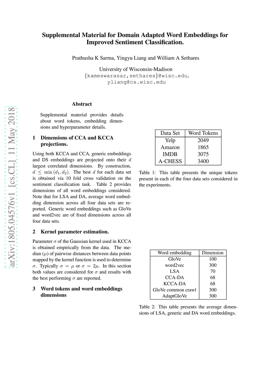 Generic word embeddings are trained on large-scale generic corpora; Domain Specific (DS) word embeddings are trained only on data from a domain of interest. This paper proposes a method to combine the breadth of generic embeddings with the specificity of domain specific embeddings. The resulting embeddings, called Domain Adapted (DA) word embeddings, are formed by aligning corresponding word vectors using Canonical Correlation Analysis (CCA) or the related nonlinear Kernel CCA. Evaluation results on sentiment classification tasks show that the DA embeddings substantially outperform both generic and DS embeddings when used as input features to standard or state-of-the-art sentence encoding algorithms for classification.